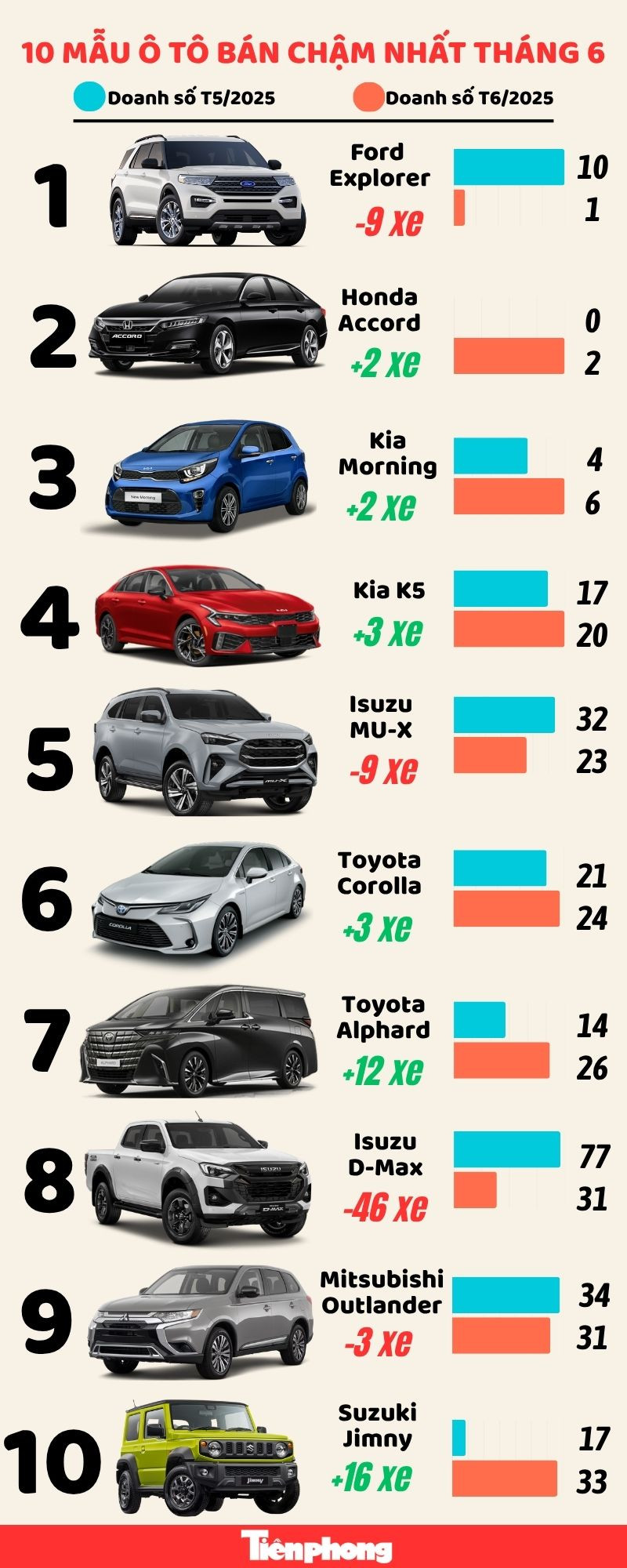 TPO - Đa số trong danh sách xe bán chậm nhất tháng 6 là ô tô Nhật, nhưng cái tên bán ít nhất lại là Ford Explorer đến từ Mỹ với chỉ 1 xe được bàn giao.