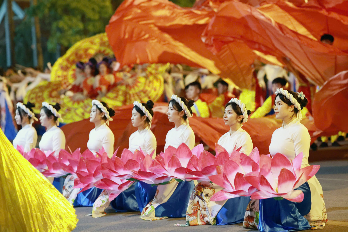 Tiết mục trống hội “Bản hùng ca toàn thắng” được dàn dựng công phu, thể hiện tinh thần hào sảng, khí thế tiến công và niềm tự hào dân tộc trong ngày toàn thắng lịch sử. Với sự tham gia của hơn 700 trống các loại – từ trống nhỏ, trống trung, trống đại đến 9 chiếc trống sấm lớn nhất Việt Nam (cao hơn 4 mét, đường kính hơn 2 mét), kết hợp cùng 300 học viên biểu diễn cờ, dân vũ, lân sư rồng, tiết mục tạo nên âm hưởng tráng lệ, mạnh mẽ và lan tỏa.