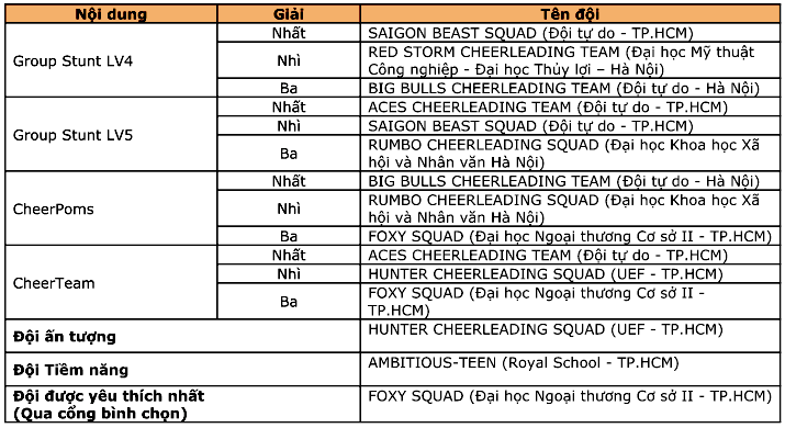 Cuộc thi có sự tranh tài của 11 đội là học sinh, sinh viên các trường THPT, đại học, trường liên cấp, nhóm thí sinh tự do tại TP. HCM và đến từ Hà Nội. Các đội thi sẽ tranh tài ở hạng mục: Đồng đội cấp độ 4 (CHEERTEAM Level 4); Nhảy tự do với bông (CHEERPOMS FREESTYLE); Nhóm cấp độ 4 và 5 (GROUPSTUNT Level 4 và Level 5).
