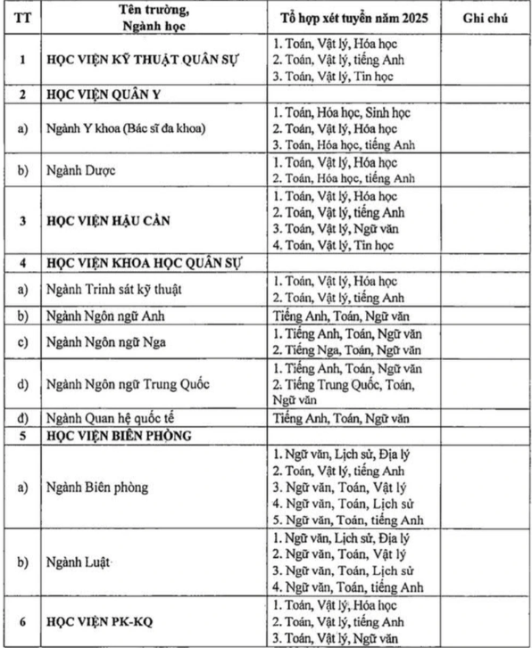 Chi tiết các tổ hợp xét tuyển của 20 trường quân đội năm 2025: