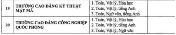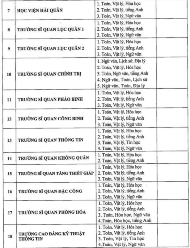 Những trường xét tuyển tổ hợp mới là Học viện Biên phòng Trường Sĩ quan Công binh, Trường Sĩ quan Pháo binh, Trường Sĩ quan Thông tin, Trường Sĩ quan Chính trị.