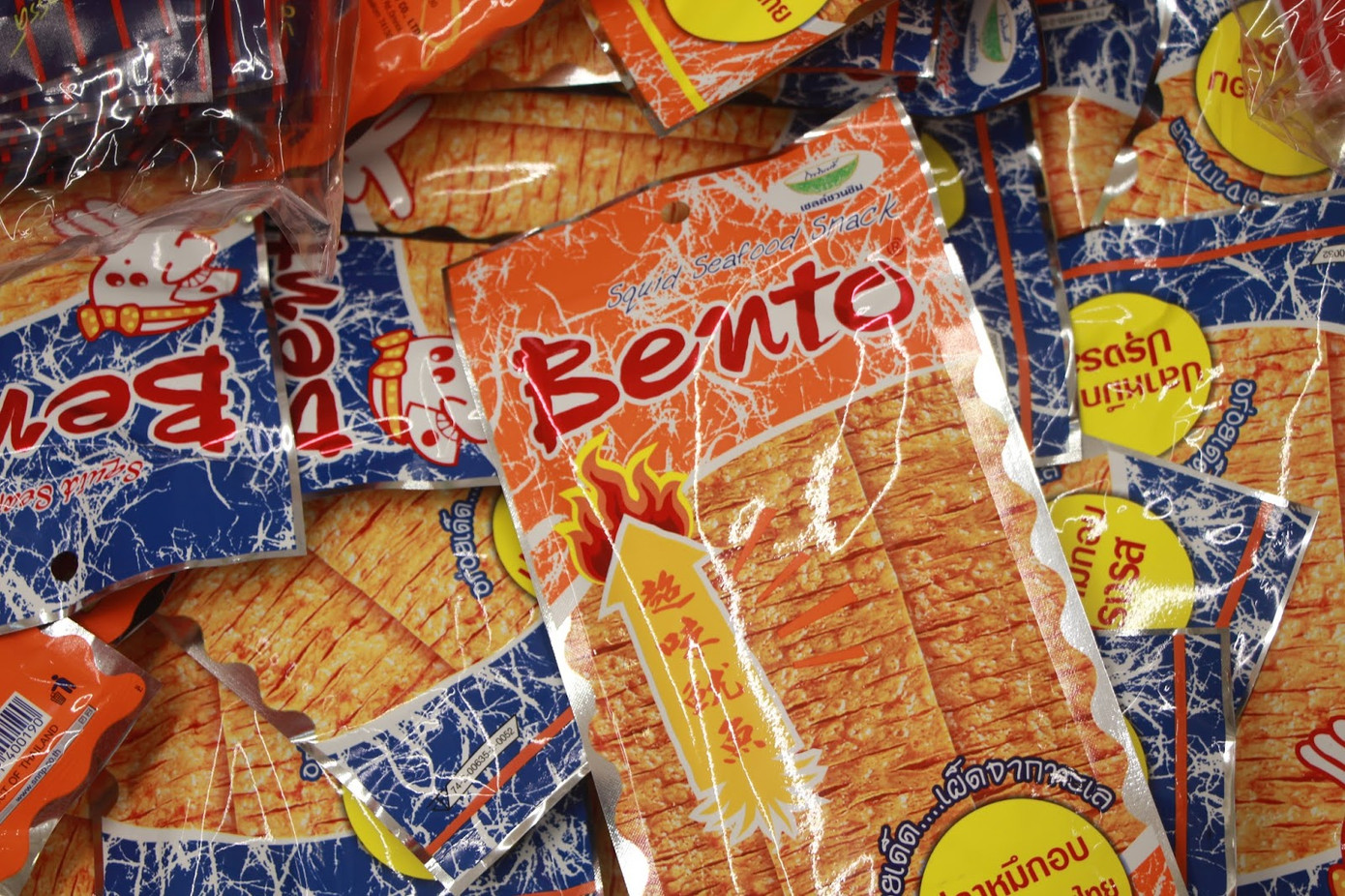 Các loại “bim bim” Thái đã gắn liền với tuổi thơ của rất nhiều người, vì thế sang đây, bạn không nên bỏ qua snack. Rất nhiều hương vị để bạn lựa chọn, nhưng bim bim có vị cay nồng thường được nhiều người lựa chọn hơn, cả ở Việt Nam lẫn bên Thái. Ngoài ra mực bento cũng rất được đáng thử và mua về. Snack khoảng 10 - 15 Bath/ gói, còn Mực Bento là 19 Bath/ gói nhé.