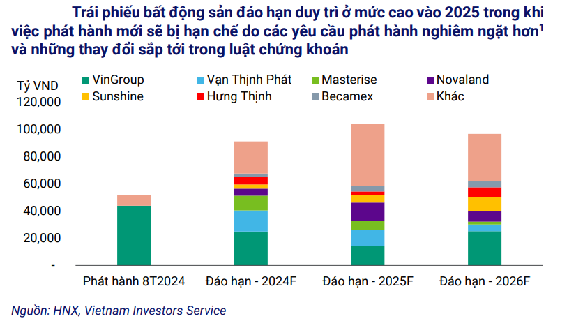 Ngoài ra, khoảng 105 nghìn tỷ đồng trái phiếu bất động sản sẽ đáo hạn trong 2025. Trong đó, ước tính rằng khoảng 50% trái phiếu đáo hạn của các chủ đầu tư trong 12 tháng tới có nguy cơ chậm trả gốc lãi.
