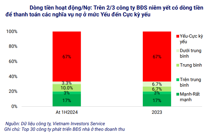 Hơn 2/3 các chủ đầu tư niêm yết có dòng tiền để trả nợ từ mức yếu đến cực kỳ yếu. Cụ thể là dòng tiền hoạt động dưới 5% tổng nợ, đặc biệt là những chủ đầu tư bị ảnh hưởng bởi các vấn đề pháp lý dự án như LDG, QCG và NVL.