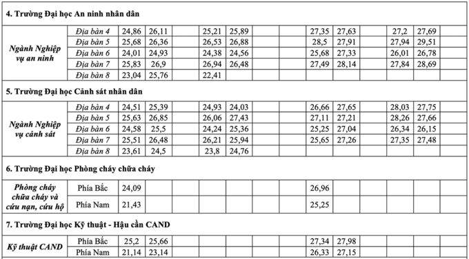 Điểm chuẩn thấp nhất là 20,25 điểm, dành cho thí sinh nam địa bàn 8 xét tuyển bằng tổ hợp C03 vào ngành Nghiệp vụ An ninh của Học viện An ninh nhân dân.