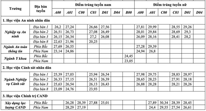 Thấp hơn một chút, điểm trúng tuyển áp dụng với thí sinh nữ ở địa bàn 1 xét tuyển bằng tổ hợp A01 vào ngành Nghiệp vụ An ninh của Học viện An ninh nhân dân là 29,99 điểm. Điểm chuẩn trên 29 cũng xuất hiện ở nhiều trường như: Học viện Cảnh sát nhân dân, Học viện Chính trị Công an nhân dân, ĐH An ninh nhân dân.