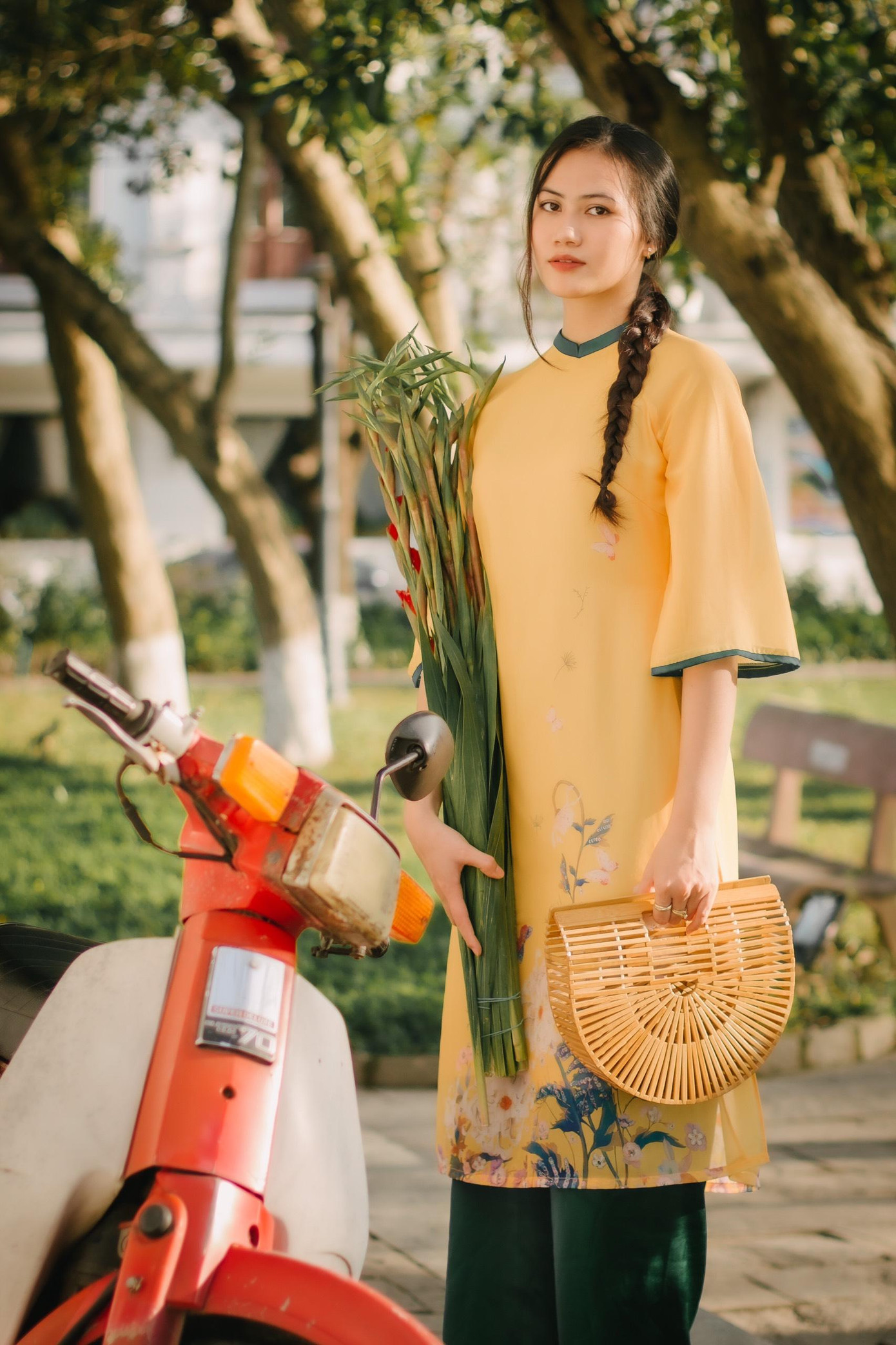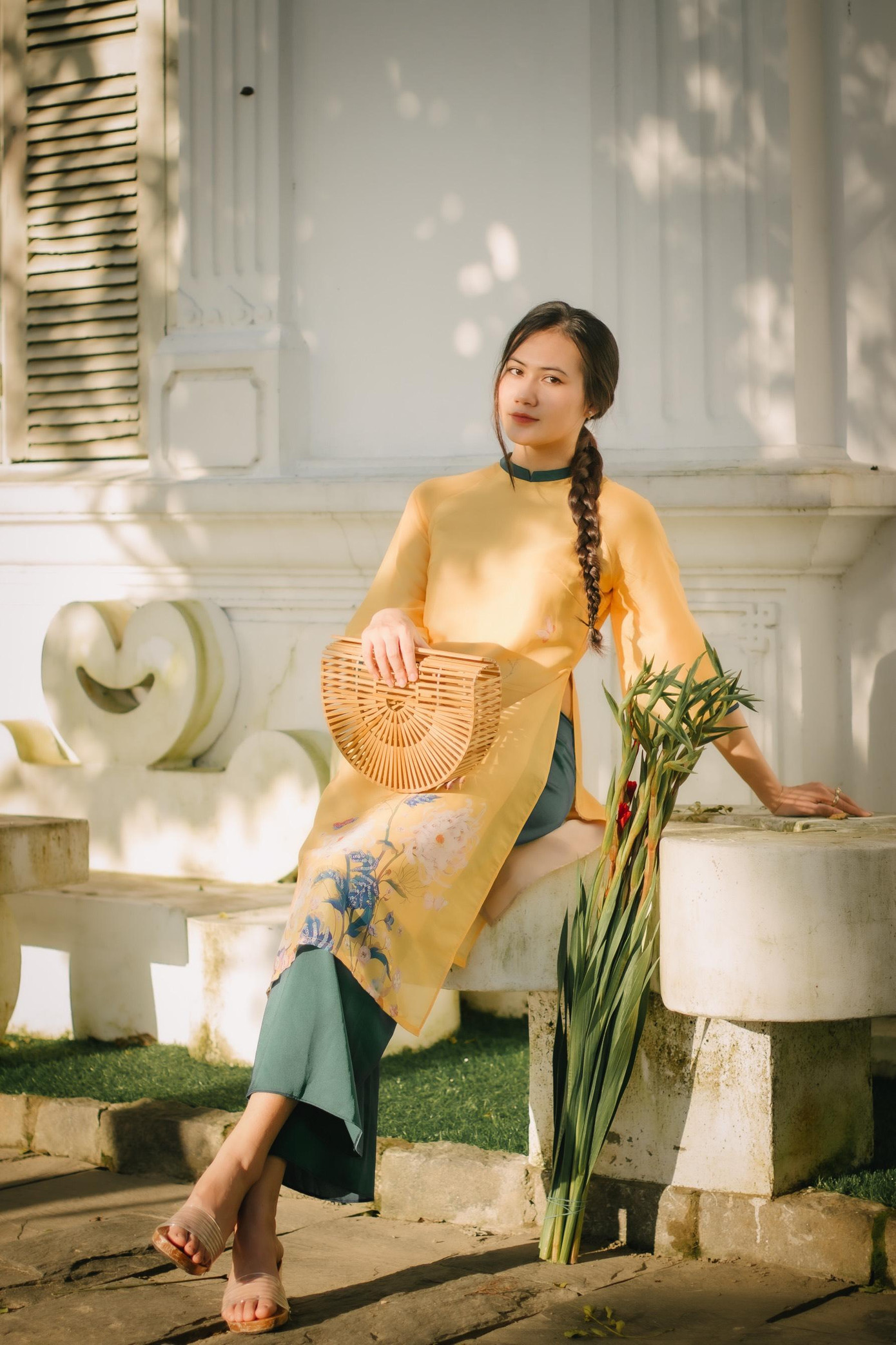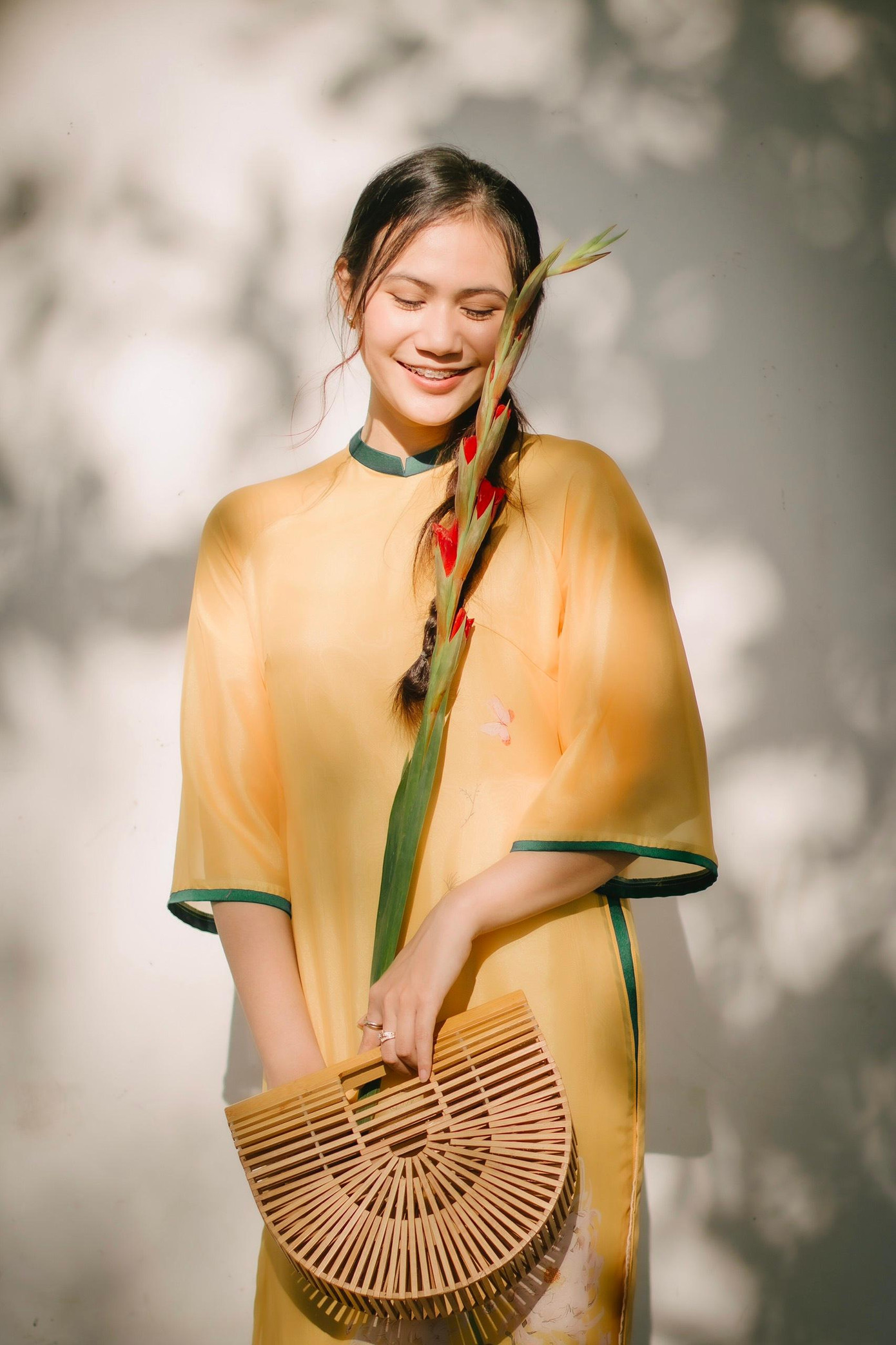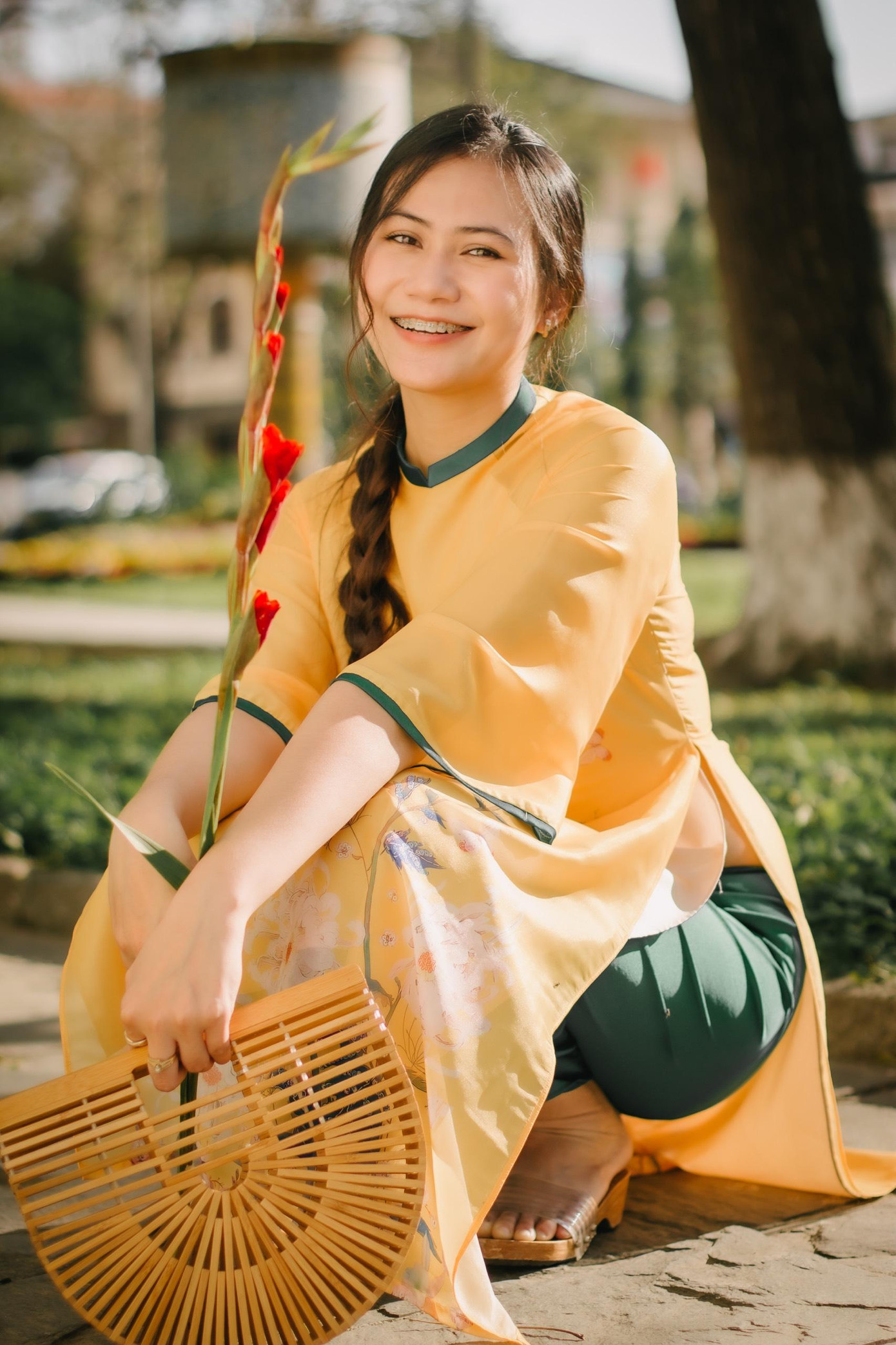 Tuy nhiên, 9X đã tạm gác lại hình ảnh cá tính thường thấy để hoá thành nàng thơ dịu dàng giữa ánh nắng chan hòa của xứ Huế. Mỹ Anh đã lựa chọn chiếc áo dài cách tân màu vàng, kết hợp với những cành lay ơn rực sắc đỏ cho bộ ảnh mới của mình.