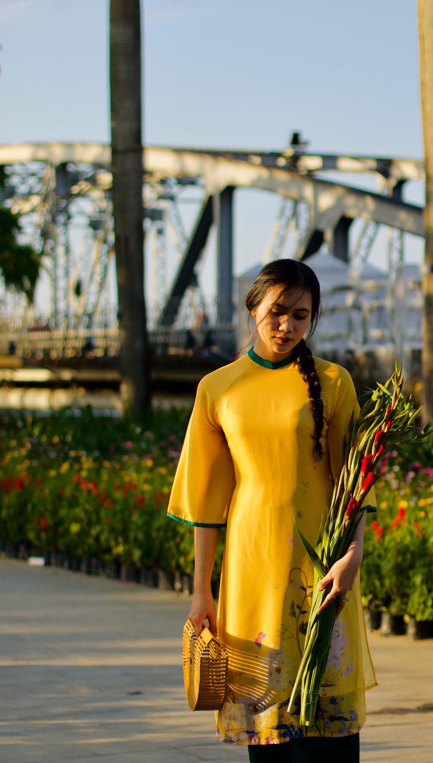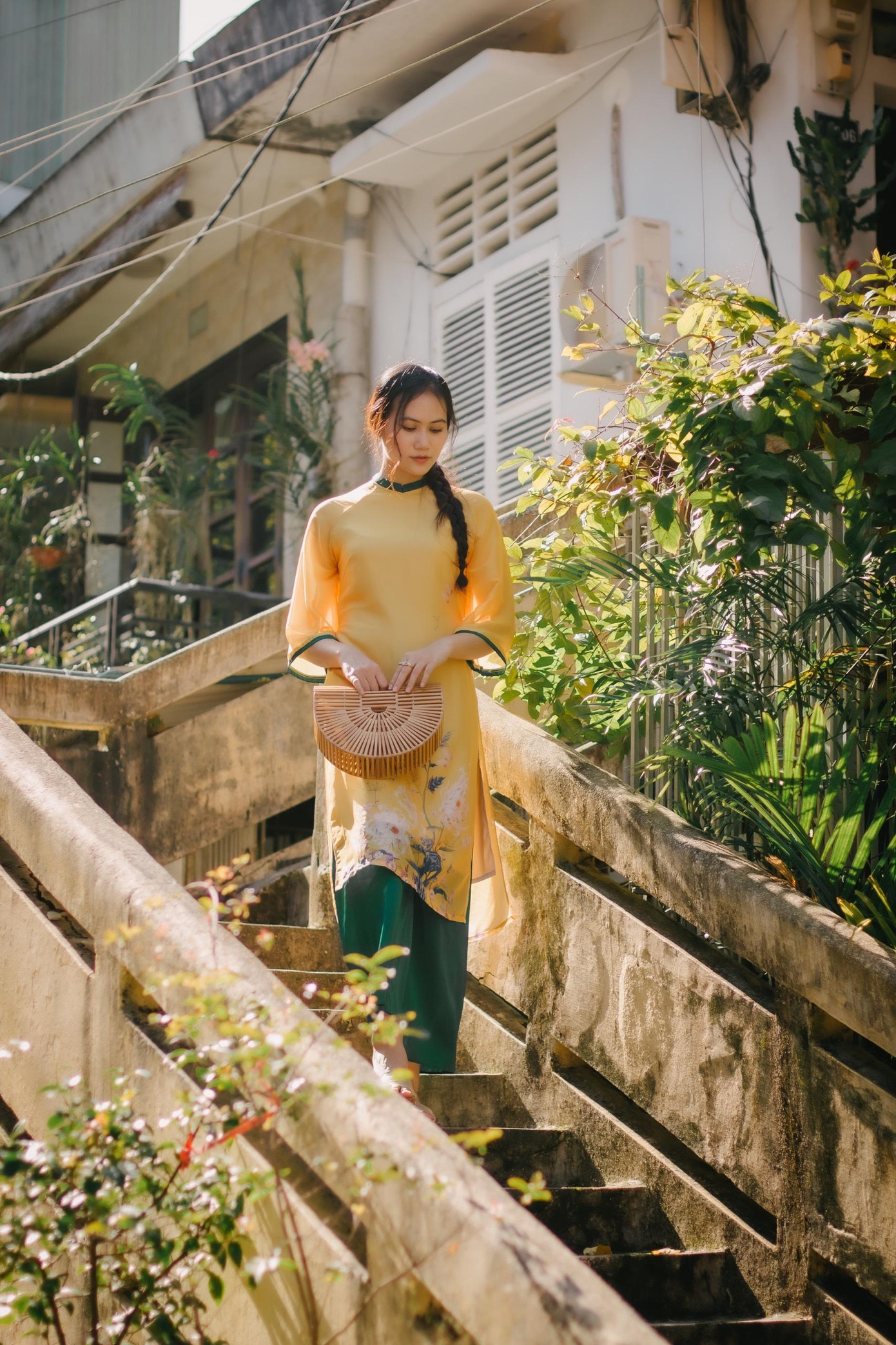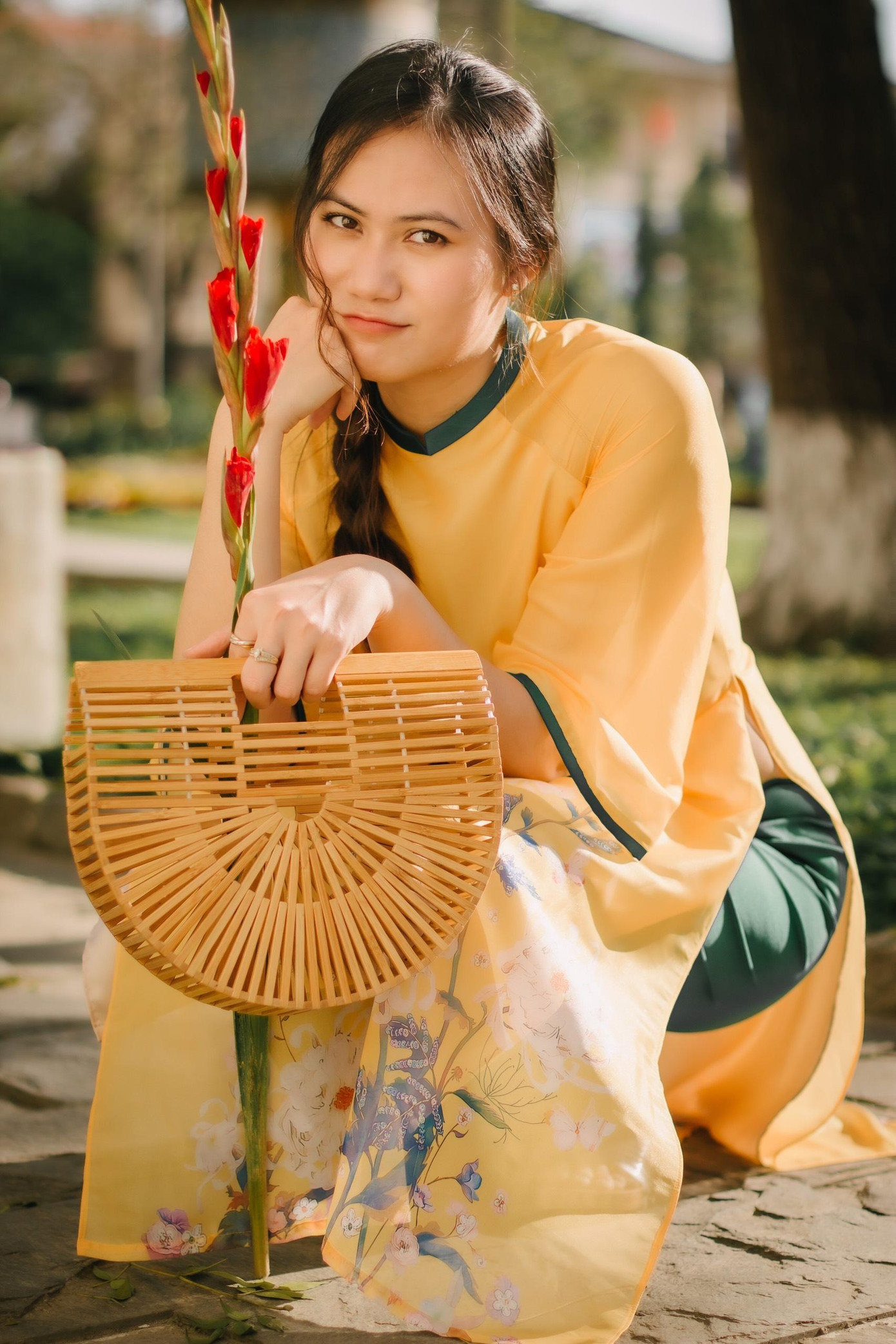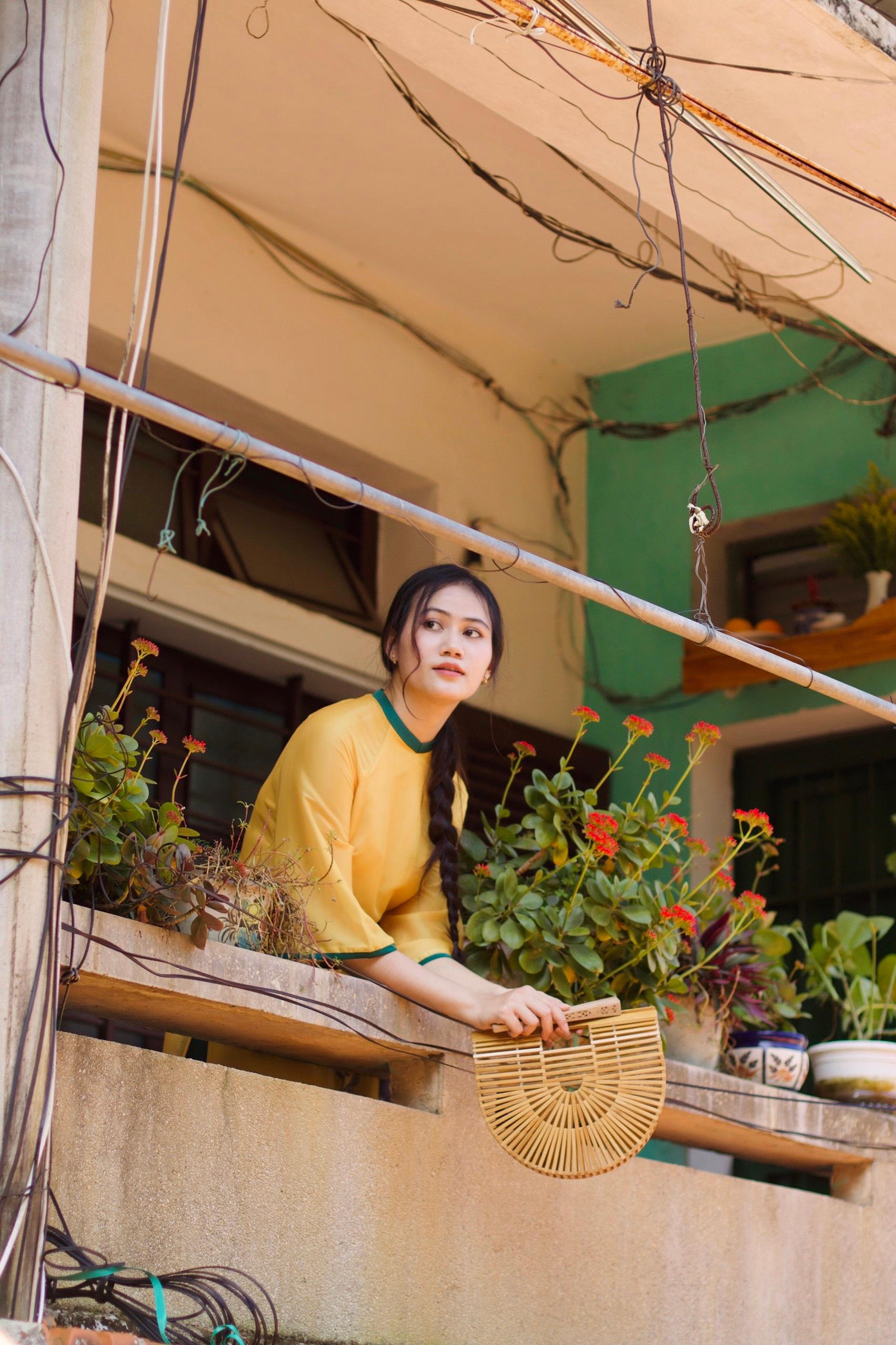 Tuy nhiên, 9X đã tạm gác lại hình ảnh cá tính thường thấy để hoá thành nàng thơ dịu dàng giữa ánh nắng chan hòa của xứ Huế. Mỹ Anh đã lựa chọn chiếc áo dài cách tân màu vàng, kết hợp với những cành lay ơn rực sắc đỏ cho bộ ảnh mới của mình.