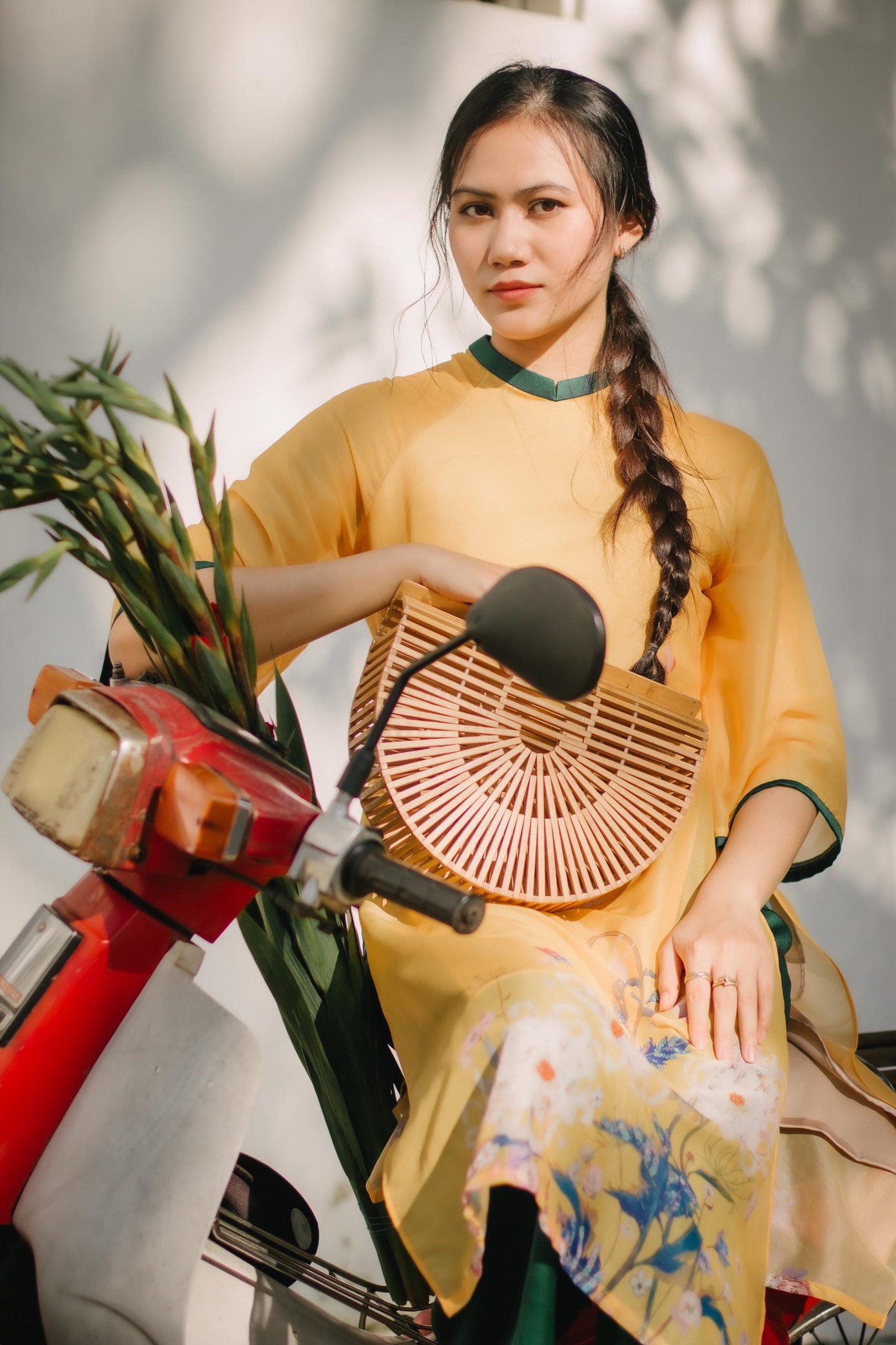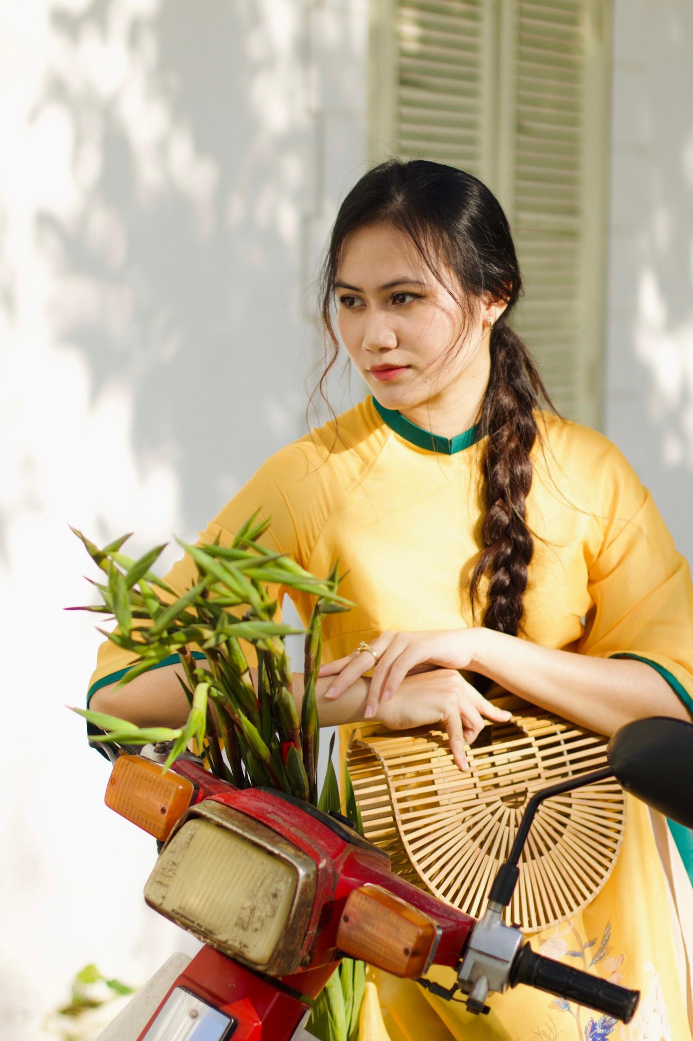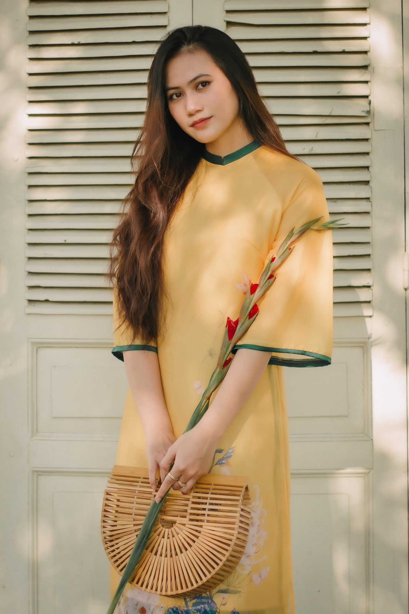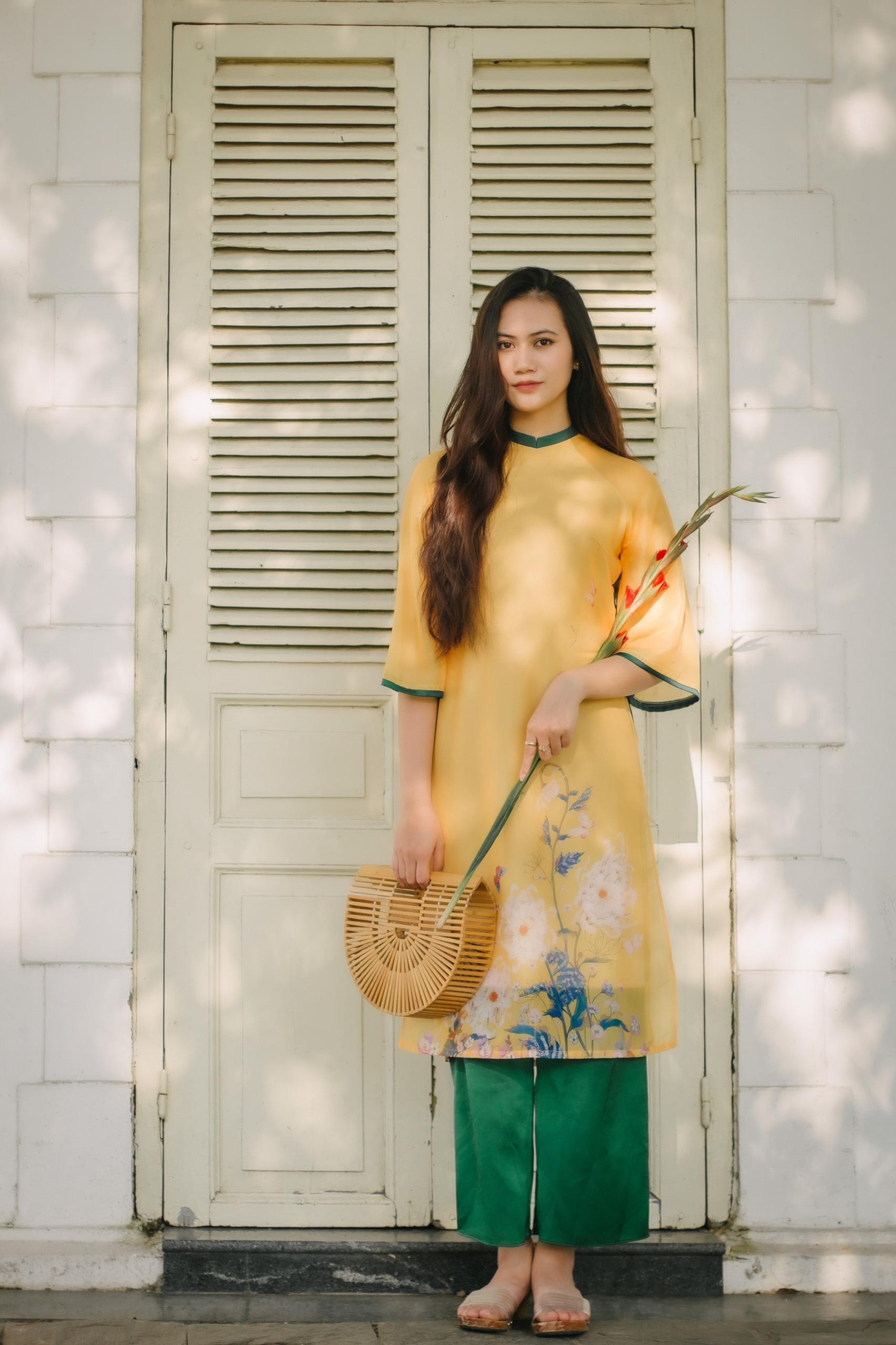 Tuy nhiên, 9X đã tạm gác lại hình ảnh cá tính thường thấy để hoá thành nàng thơ dịu dàng giữa ánh nắng chan hòa của xứ Huế. Mỹ Anh đã lựa chọn chiếc áo dài cách tân màu vàng, kết hợp với những cành lay ơn rực sắc đỏ cho bộ ảnh mới của mình.