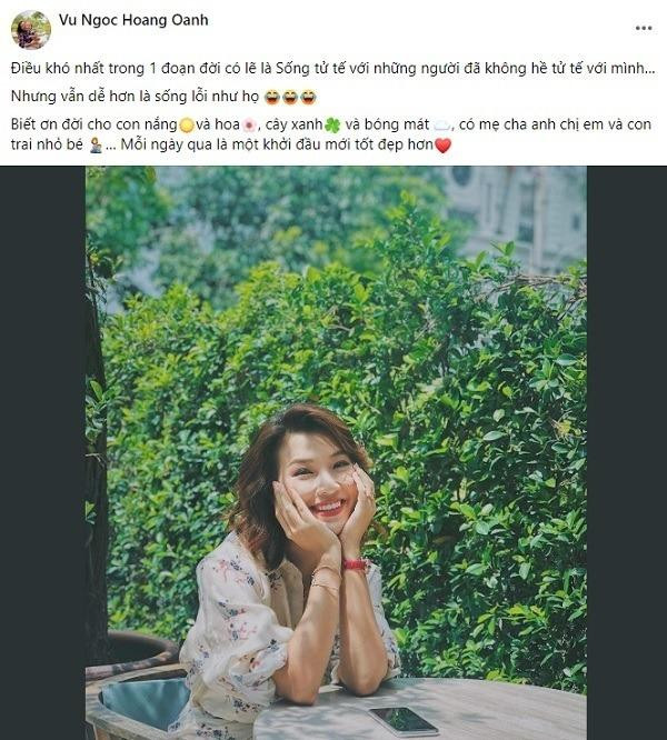 Còn trên Facebook, Hoàng Oanh có bài đăng đầy ẩn ý: “Điều khó nhất trong một đoạn đời có lẽ là sống tử tế với những người đã không hề tử tế với mình. Nhưng vẫn dễ hơn là sống lỗi như họ. Biết ơn đời cho con nắng và hoa, cây xanh và bóng mát, có mẹ cha anh chị em và con trai nhỏ bé. Mỗi ngày qua là một khởi đầu mới tốt đẹp hơn”.