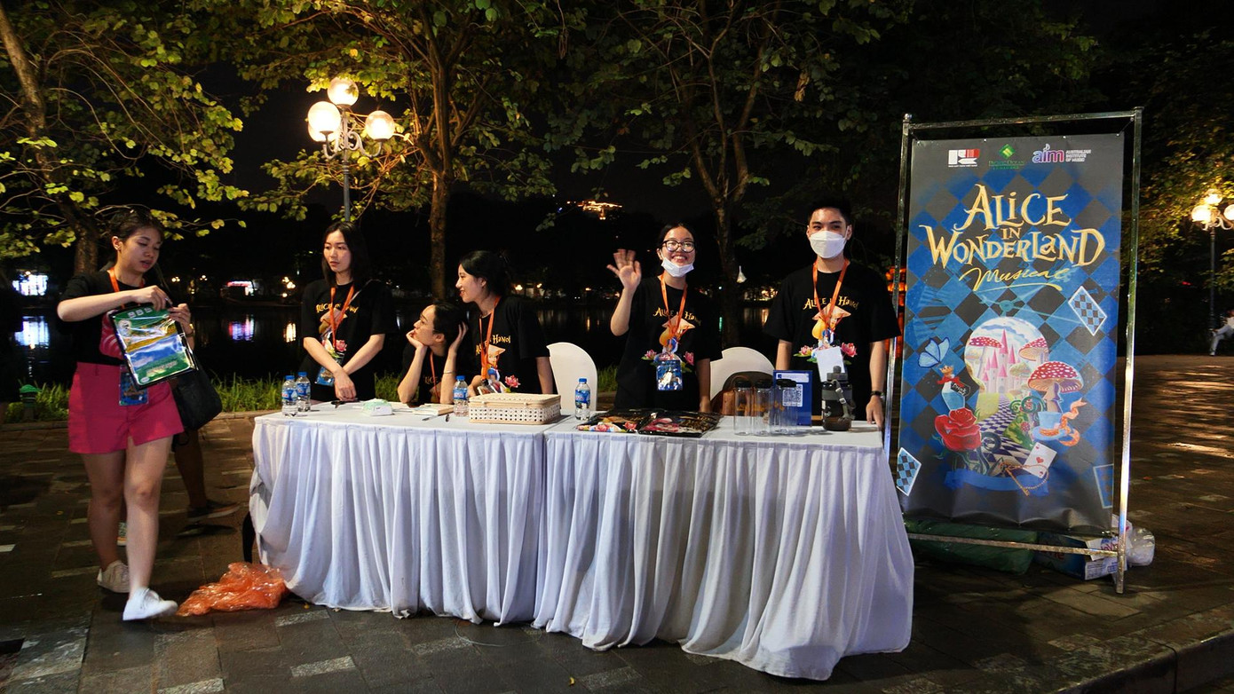Vào tối hôm qua, ngày 24/9, dàn diễn viên của vở nhạc kịch Alice in Wonderland đã có buổi ra mắt công chúng chính thức lần đầu tiên trên phố đi bộ hồ Hoàn Kiếm. Với các tiết mục hấp dẫn, mang lại không khí sôi động, hiện đại và văn minh, các bạn diễn viên trẻ đã hoàn toàn chiếm được cảm tình của khán giả, tạo nên một điểm nhấn mới mẻ, độc đáo trong buổi tối cuối tuần.