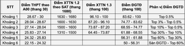 Với phương thức xét điểm thi đánh giá tư duy, điểm chuẩn từ 50,29 đến 83,82/100. Ở nhóm xét tuyển tài năng, điểm chuẩn khoảng 70,89 - 104,58/110.