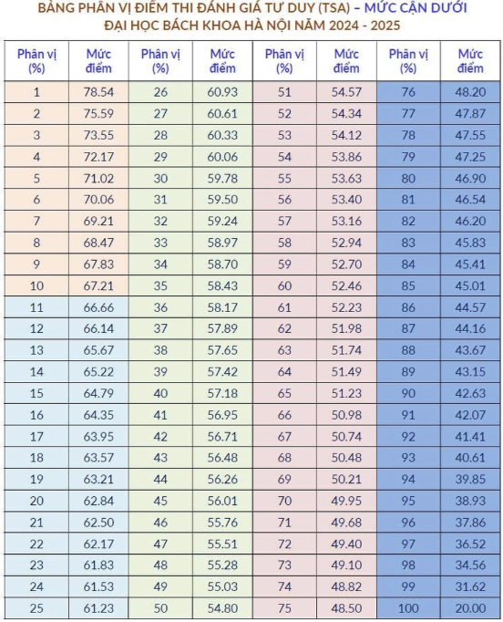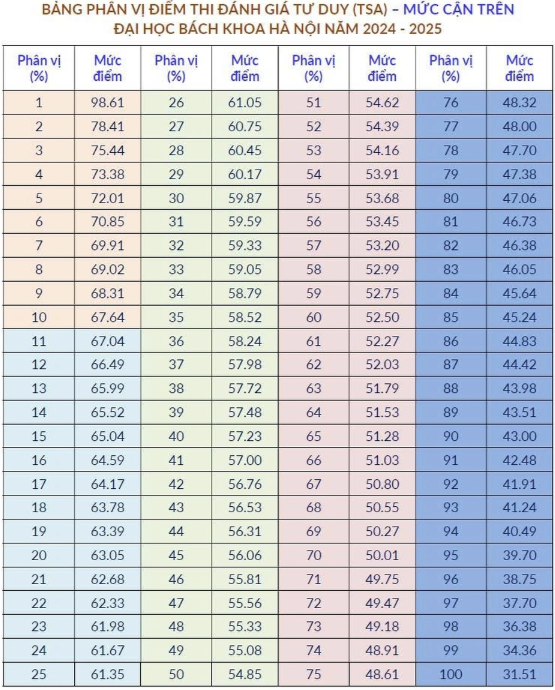 Bảng phân vị kết quả thi đánh giá tư duy Đại học Bách khoa Hà Nội của khoảng 50.000 thí sinh năm 2024 và 2025 như sau:
