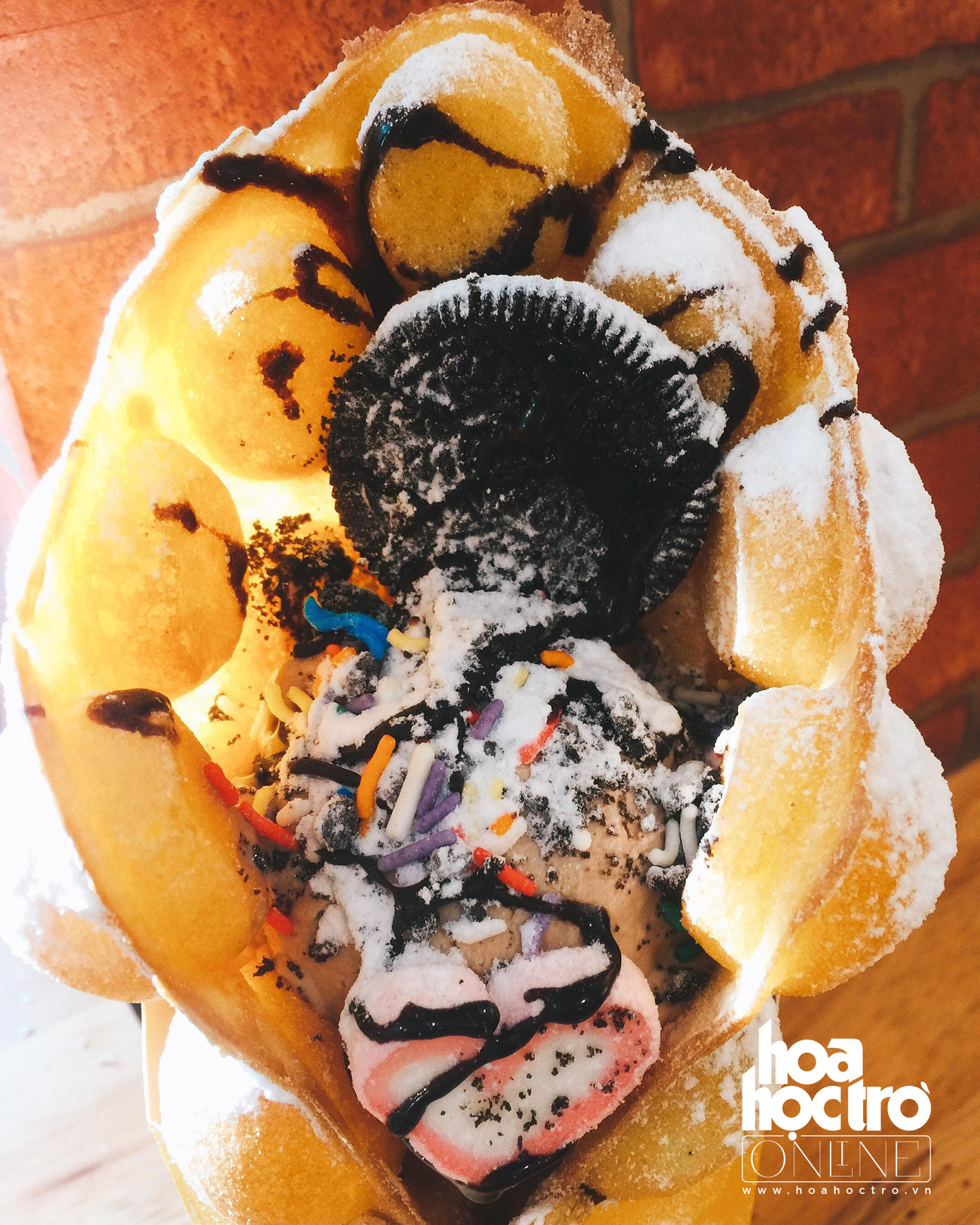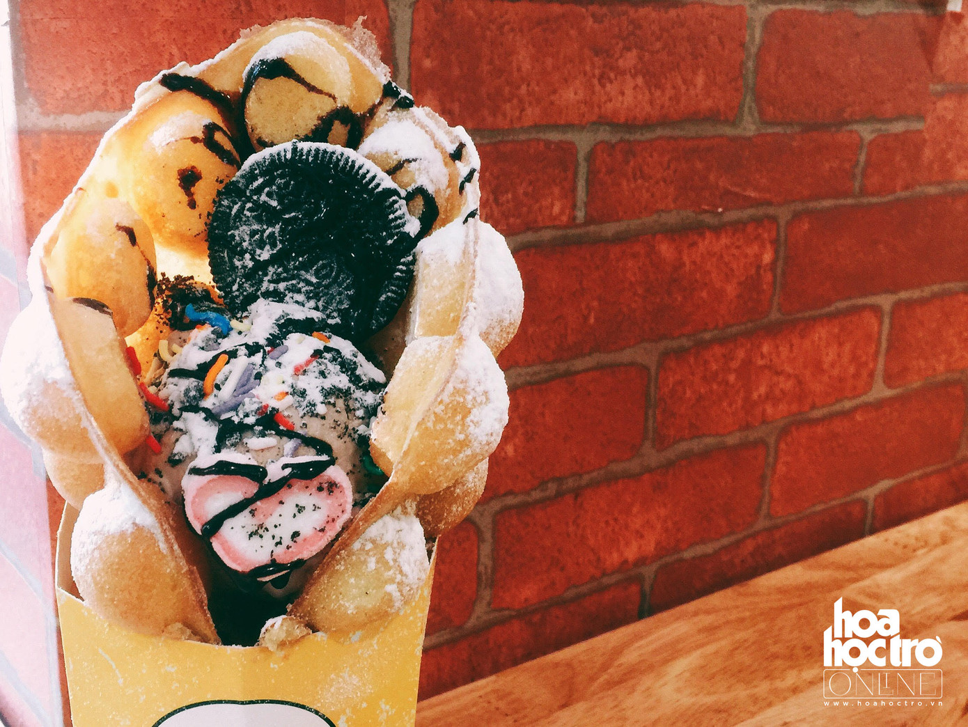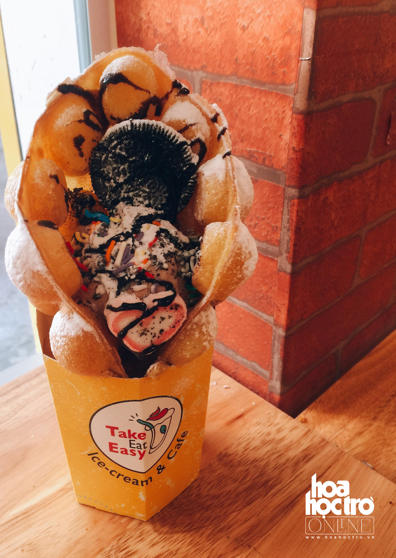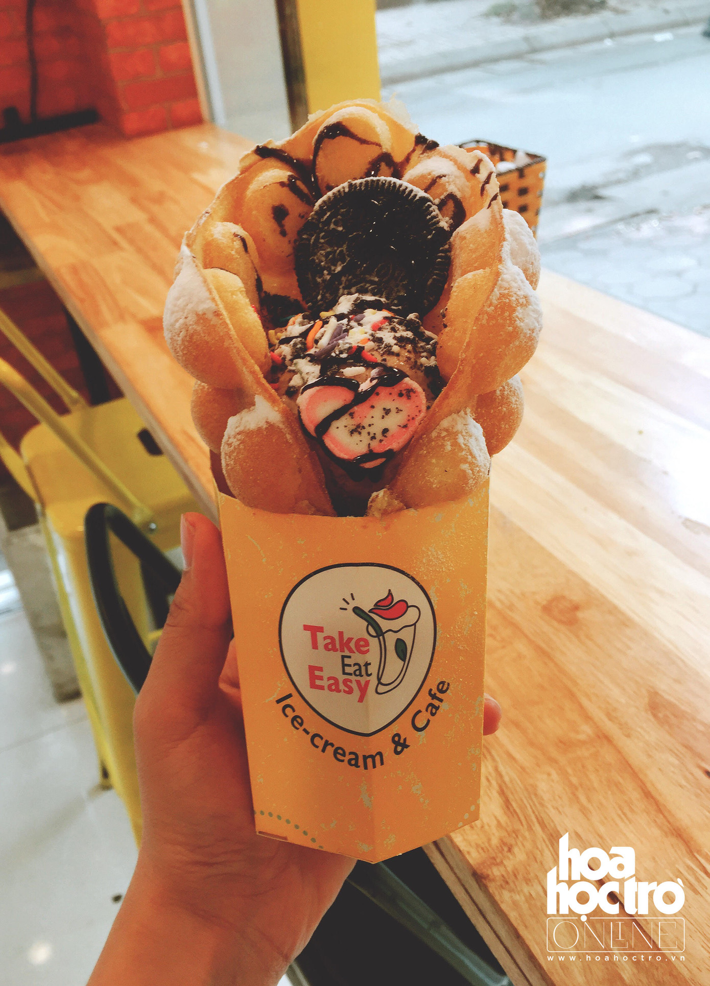 Ăn trước một miếng kem mát lẹm, rồi cắn thêm miếng bánh trứng gà non. Bánh kết hợp với kem nên bánh không quá ngấy, còn kem thì đậm vị trứng nên càng ngon ngậy và dậy mùi thơm, cộng thêm các loại topping khác sẽ khiến cho vị kem vốn đã quá quen thuộc kia trở nên thú vị hơn.