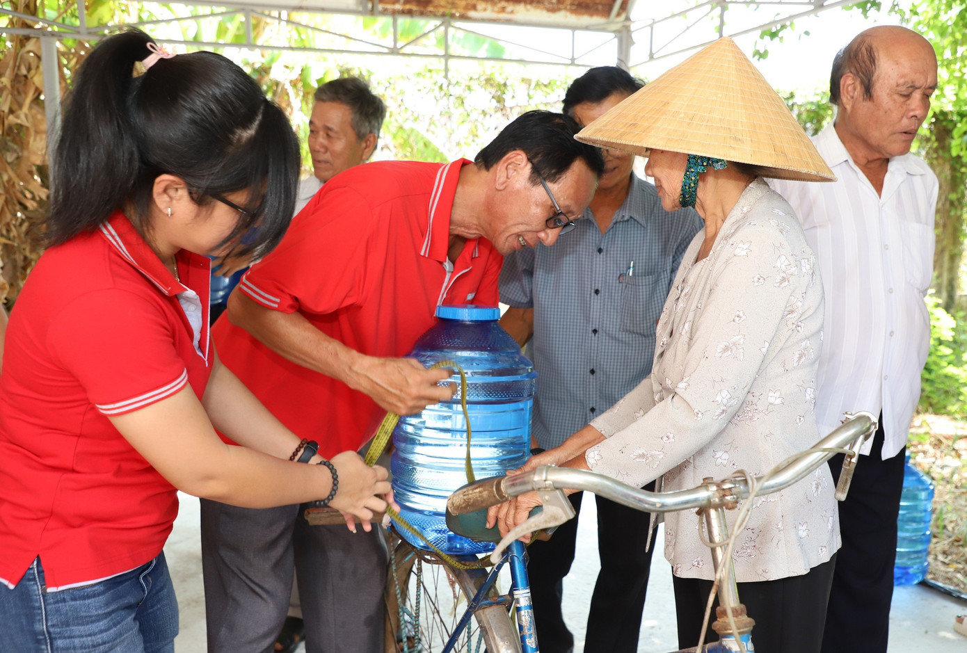 | Tình nguyện viên của chương trình hỗ trợ người dân xã Tân Thủy đưa nước lên xe. |