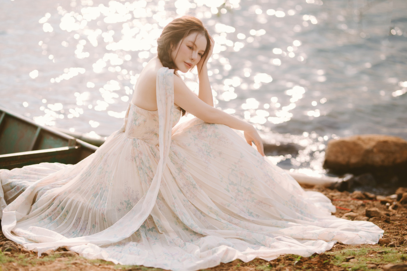 Bối cảnh biển Hồ T'nưng là nơi lý tưởng để Lý Nhã Kỳ thể hiện sự quyến rũ, phóng khoáng. Cô diện chiếc váy cúp ngực với tà váy dài thướt tha bên mép hồ.