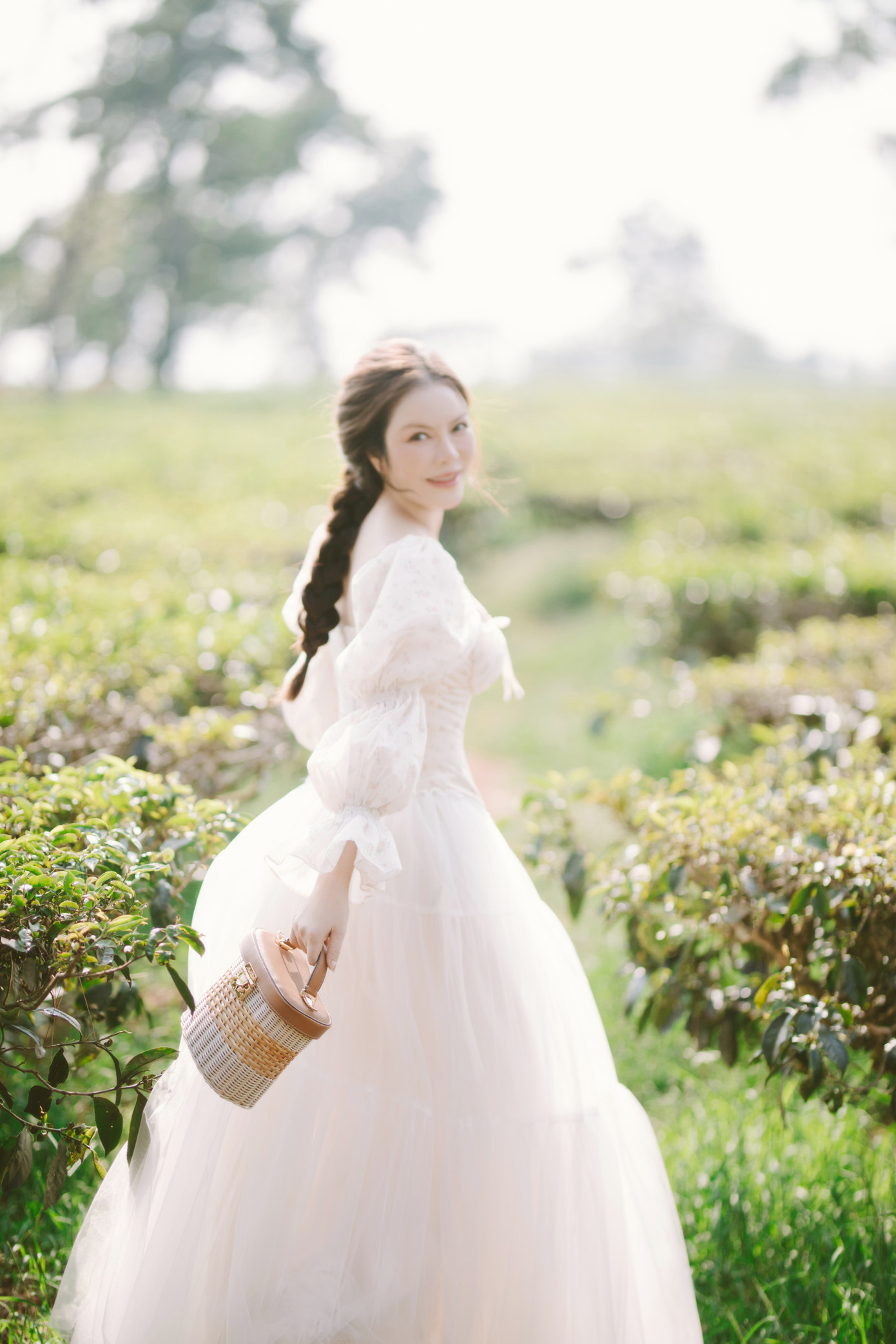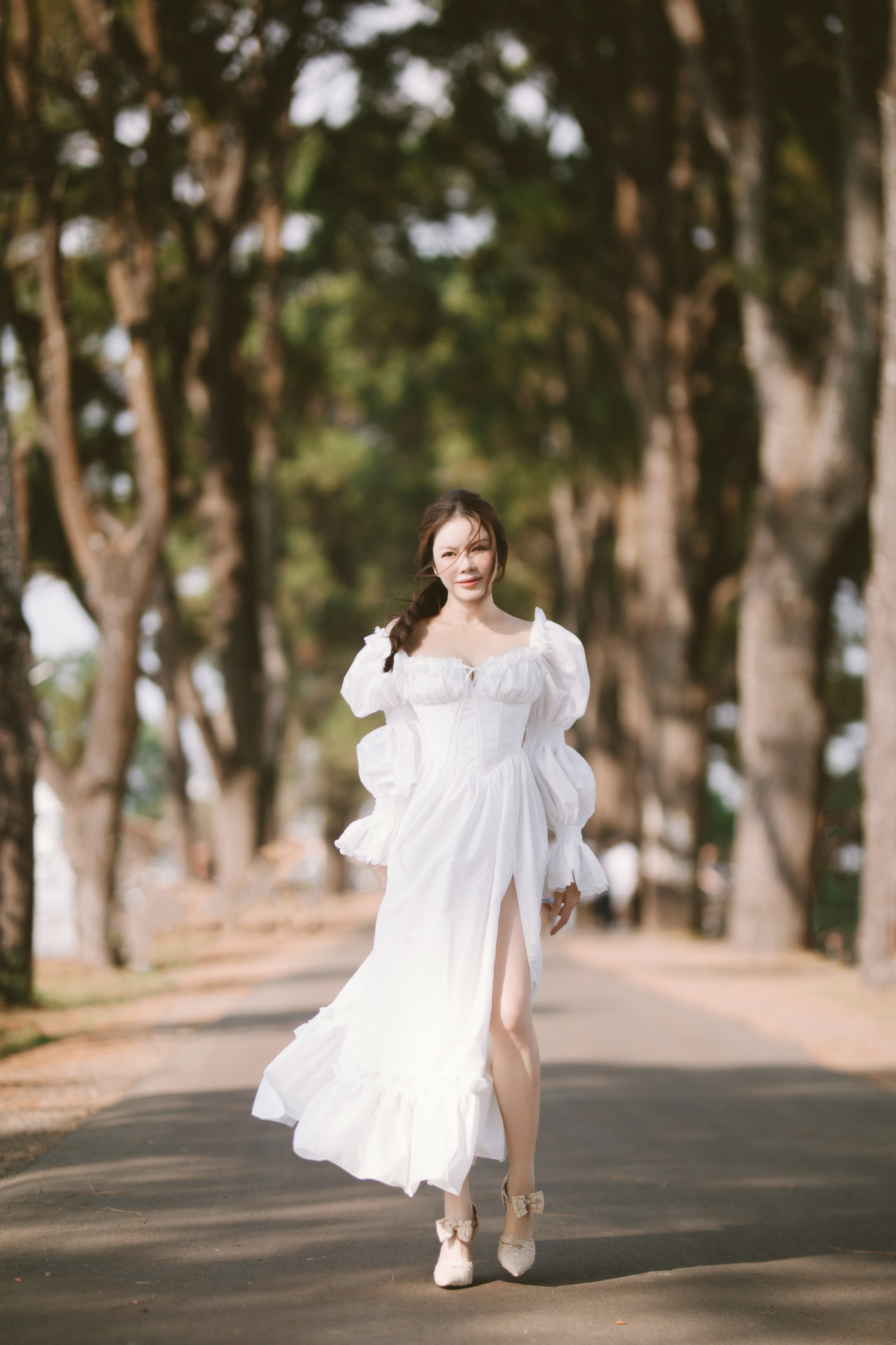 Cô khoác lên mình một chiếc đầm maxi màu trắng tinh khôi, chất liệu mềm mại bay bổng trong gió, gợi nhớ đến thời tân cổ điển. Mái tóc buông xõa tự nhiên, trang điểm trong suốt, nhấn vào đôi môi căng mọng.