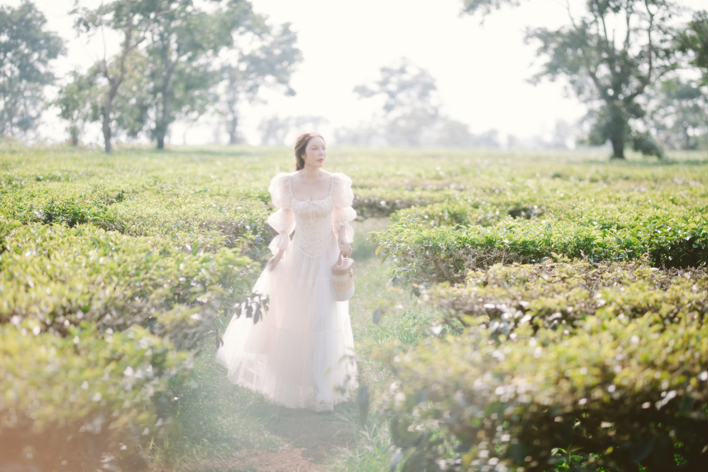Hình ảnh Lý Nhã Kỳ đứng giữa những luống chè, đôi mắt nhìn xa xăm ra mặt hồ phẳng lặng, tạo nên một khung cảnh vừa thanh lịch, vừa lãng mạn, tôn vinh vẻ đẹp dịu dàng, thuần khiết và sự giao hòa tuyệt đối với thiên nhiên. Bộ ảnh ở đây không chỉ khoe trang phục, mà còn kể câu chuyện về sự thư thái, tĩnh tại trong tâm hồn.