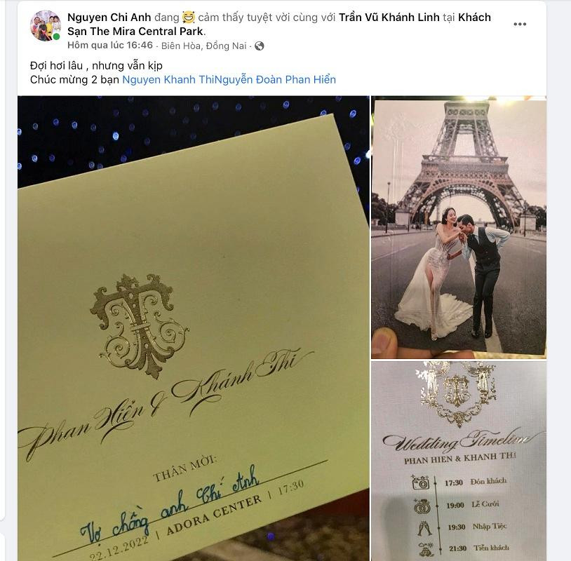 Theo thông tin trên thiệp, hôn lễ của Khánh Thi - Phan Hiển sẽ diễn ra vào ngày 22/12 tại một trung tâm tiệc cưới sang trọng tại TP. HCM. Tấm thiệp được thiết kế đơn giản với bức ảnh cưới cặp đôi chụp tại Paris. Trong thiệp còn có thông tin dress code là màu trắng và hồng pastel. Thời gian gần đây, trong khi nhiều người đẹp nổi tiếng khác khi lên xe hoa đều có quy định khách mời không nên mặc màu trắng vì trùng màu váy cưới của cô dâu thì Khánh Thi lại có lựa chọn khác biệt.