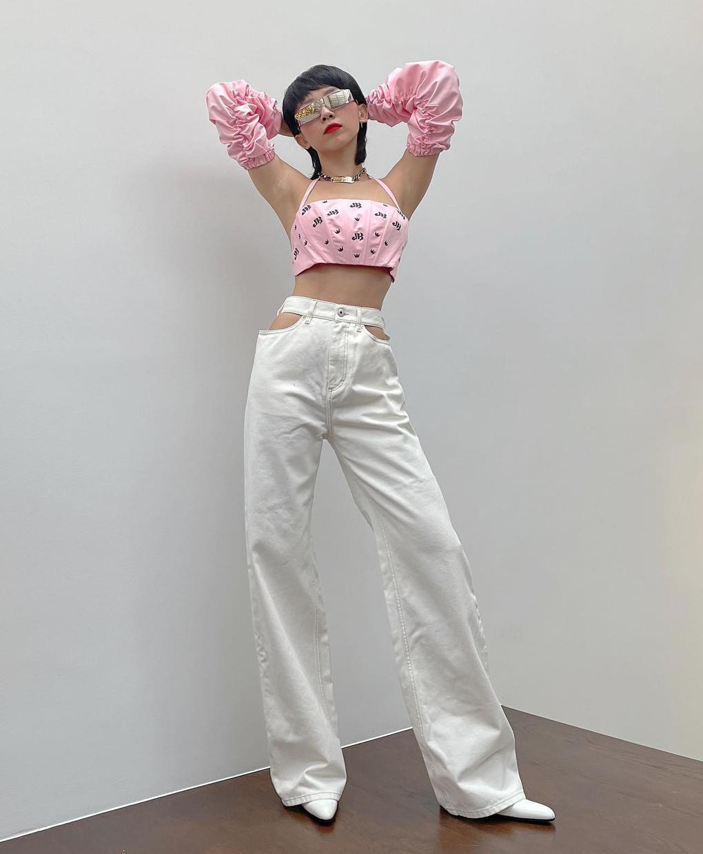 Tóc Tiên cũng có một mẫu quần tương tự với Chi Pu, cắt khoét vừa đủ nên được khen là gợi cảm mà không phản cảm.