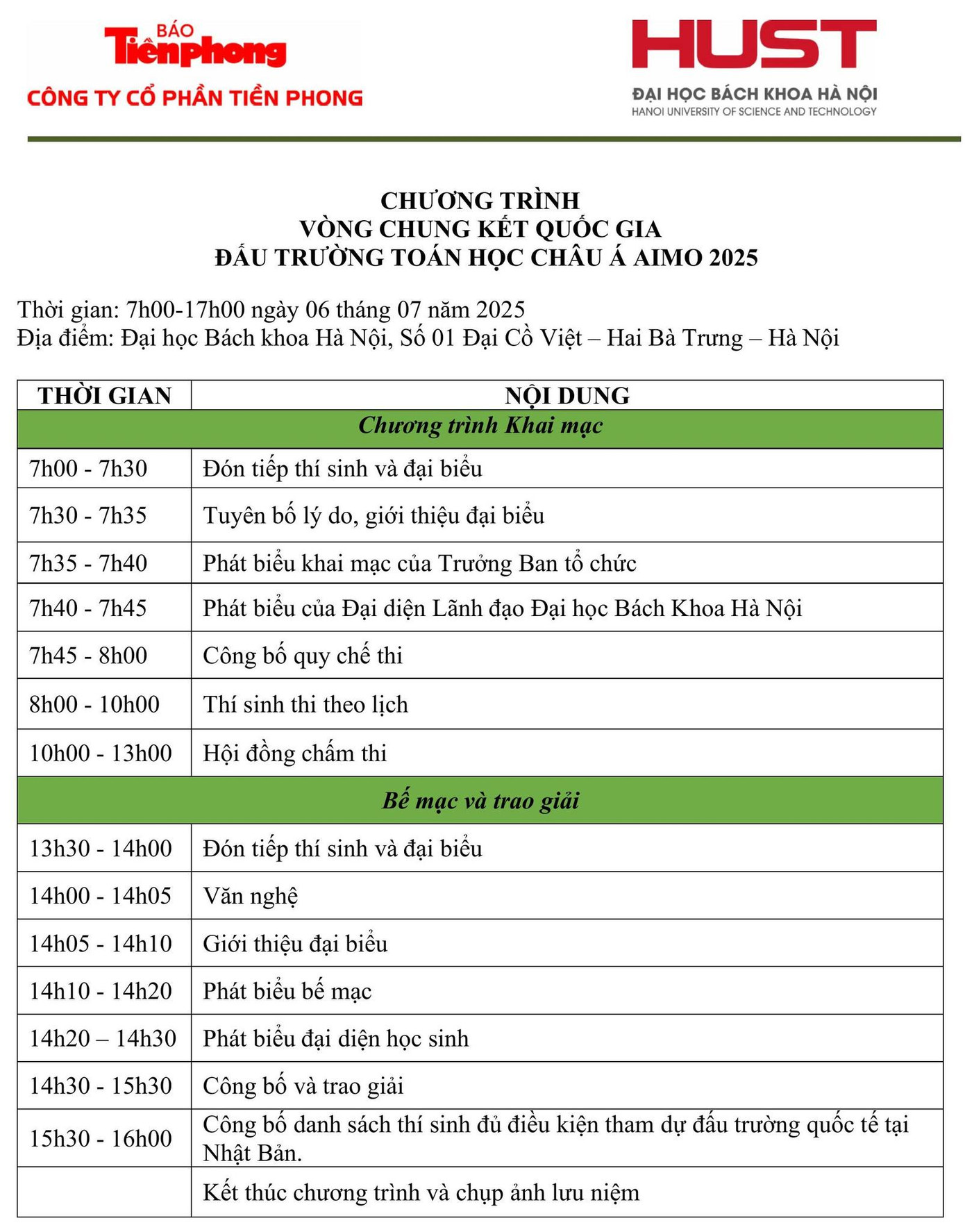 Ngoài ra, BTC sẽ công bố danh sách đội tuyển Việt Nam tham dự Chung kết quốc tế AIMO 2025 tại Tokyo, Nhật Bản. Đây là những gương mặt tiêu biểu nhất - đại diện cho trí tuệ, bản lĩnh và khát vọng vươn tầm quốc tế của học sinh Việt Nam.