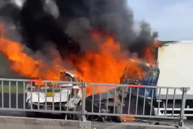 Trong đó, 2 xe ô tô bị xe tải này ép chặt vào đuôi xe container rồi sau đó các phương tiện này bốc cháy.