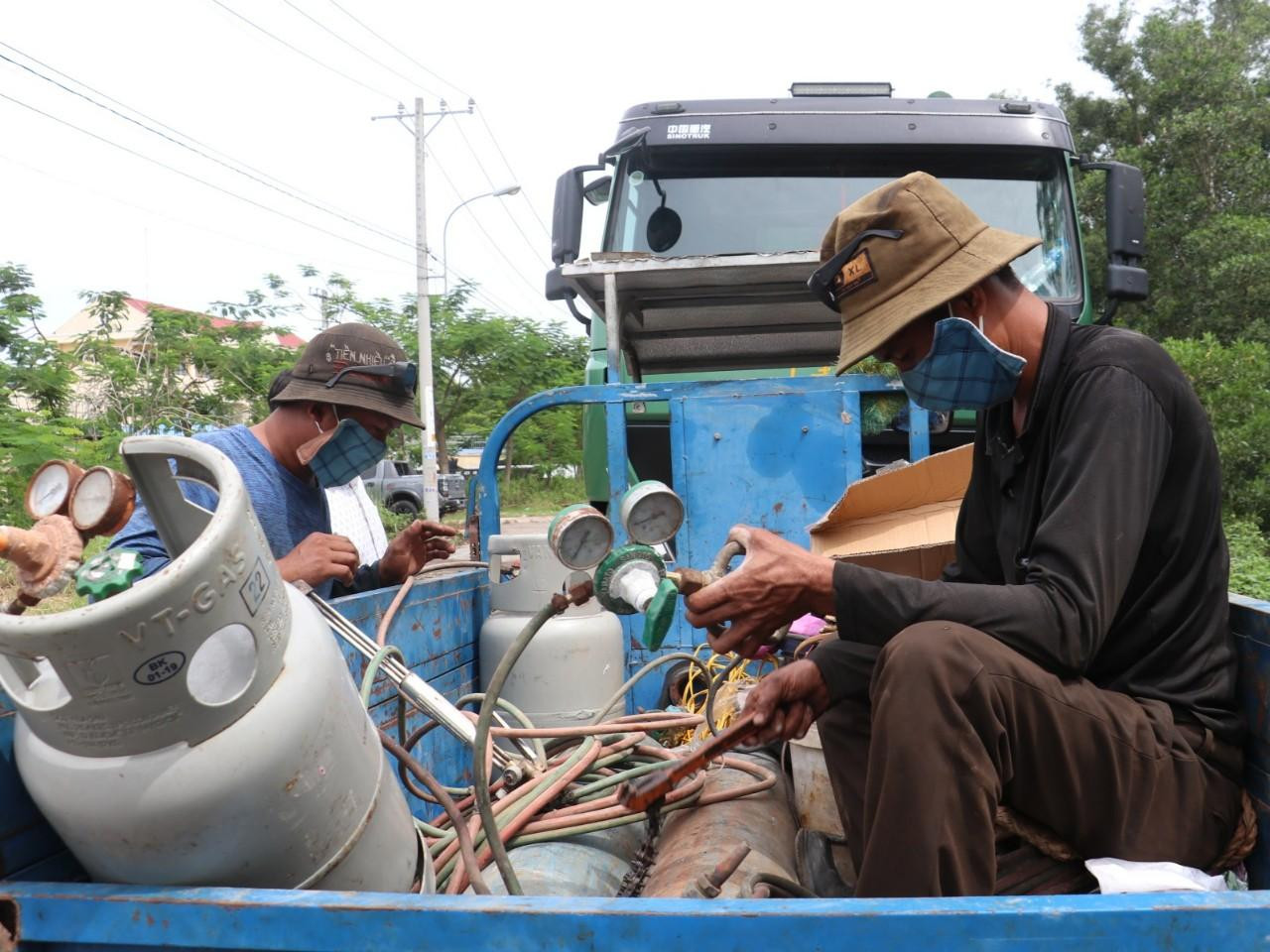 | Một nhóm thợ hàng được tài xế và chủ xe thuê cắt phần thùng cơi nới |