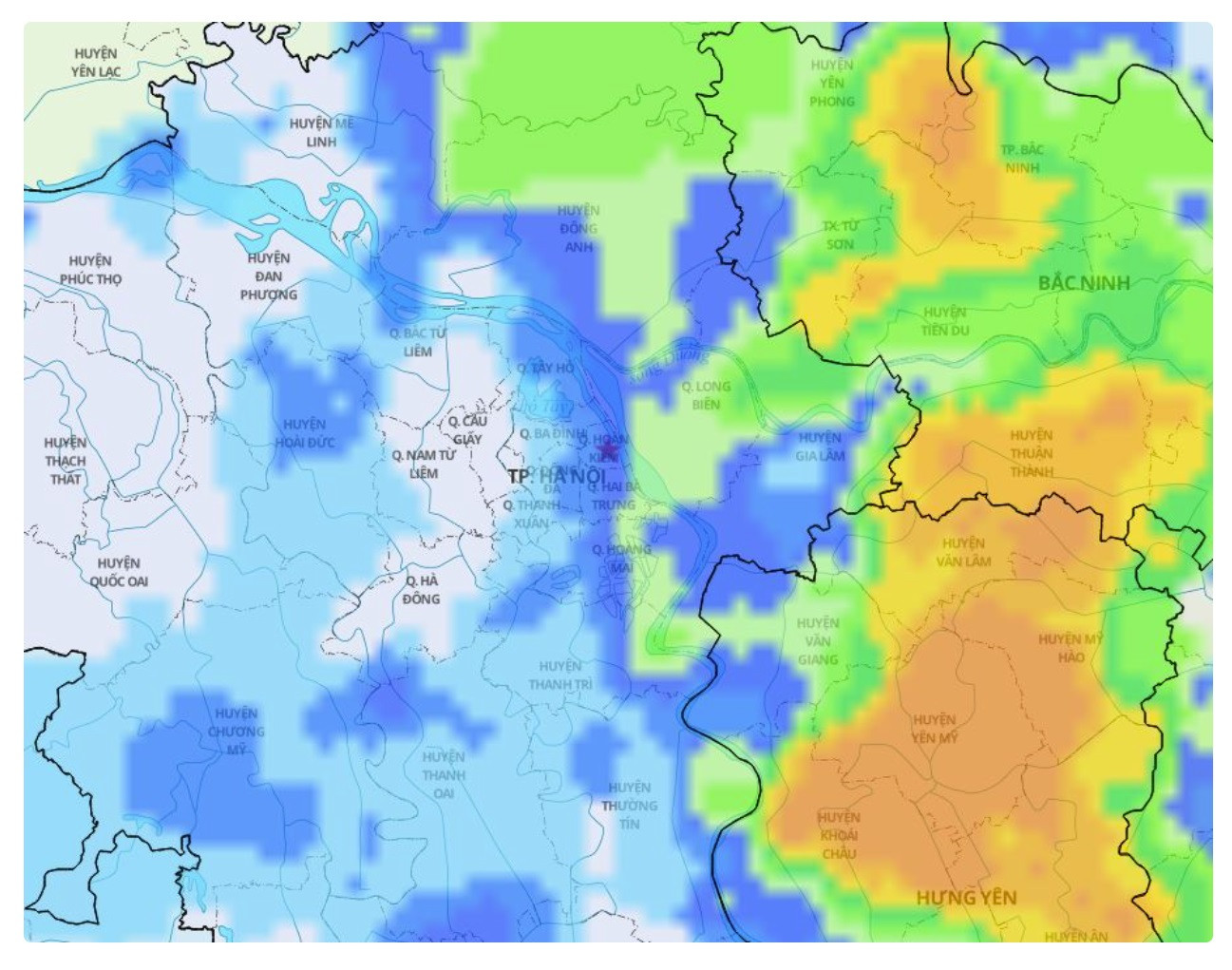 Vùng mây đối lưu này đang có xu hướng mở rộng ảnh hưởng. Trong khoảng 15 đến 30 phút tới, vùng mây dông trên sẽ ảnh hưởng, gây mưa rào và dông cho các quận Long Biên, Hoàng Mai, Hai Bà Trưng, Hoàn Kiếm, Ba Đình, Tây Hồ, sau đó có khả năng mở rộng ảnh hưởng sang các quận nội thành khác của thành phố Hà Nội. Trong mưa dông có khả năng xảy ra lốc, sét mưa đá và gió giật mạnh.