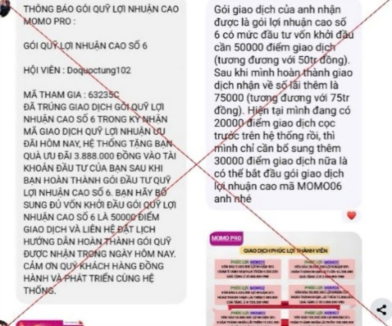 Do tin tưởng, anh H. đã tải ứng dụng MoMo Pro và đăng nhập để nhận thưởng. Sau đó các đối tượng mời chào anh tham gia vào hệ thống quỹ đầu tư MoMo Pro, mỗi lần nạp tiền tham gia giao dịch sẽ nhận được lợi nhuận lên đến 50% so với số vốn bỏ ra. Tin lời, anh H. đã thực hiện 3 lần nạp tiền, tổng cộng là 330 triệu đồng. Tuy nhiên, khi thực hiện thao tác rút tiền, hệ thống bất ngờ báo lỗi và yêu cầu anh nộp thêm 330 triệu đồng mới có thể rút được số tiền đã đầu tư. Lúc này, anh H. nhận ra mình đã bị lừa và đến cơ quan Công an trình báo.