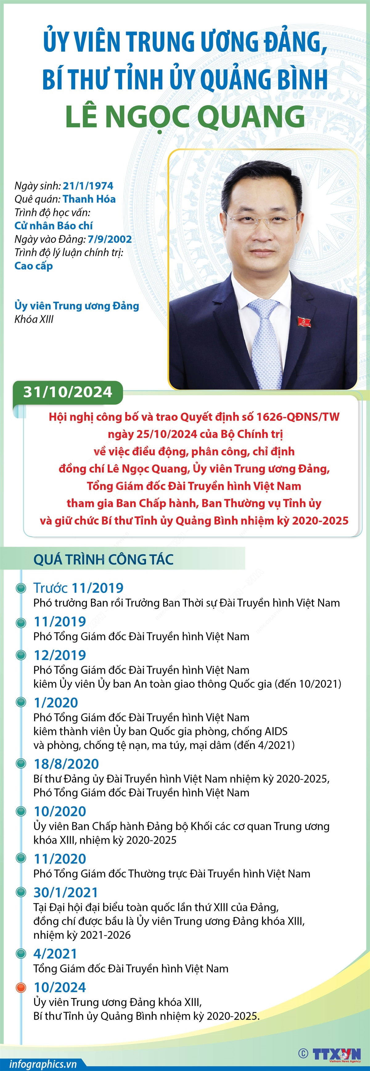 Bộ Chính trị điều động, phân công, chỉ định đồng chí Lê Ngọc Quang, Ủy viên Trung ương Đảng, Tổng Giám đốc Đài Truyền hình Việt Nam, tham gia Ban Chấp hành, Ban Thường vụ Tỉnh ủy và giữ chức Bí thư Tỉnh ủy Quảng Bình nhiệm kỳ 2020-2025.