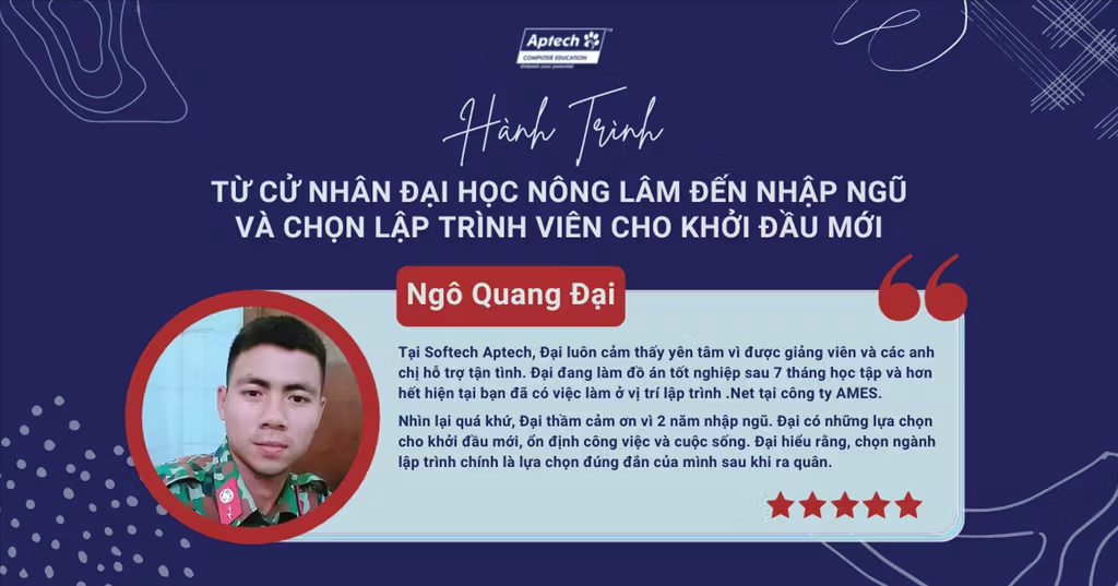 Nhìn lại quá khứ, Đại thầm cảm ơn những năm tháng quân ngũ là bước đệm để Đại có thể nhìn nhận lại bản thân, lựa chọn khởi đầu mới với ngành lập trình. Đại cũng gửi gắm lời cảm ơn đến Aptech đã mang lại một môi trường đào tạo chuyên nghiệp, chuẩn quốc tế để cậu thực hiện được ước mơ với nghề nghiệp mình yêu thích. Với Đại, “không bao giờ là quá muộn để học tập và theo đuổi đam mê”. Tuổi trẻ chỉ có một lần, cậu can đảm đi theo con đường mình mơ ước. “Em biết rằng có thể thành công, có thể thất bại, nhưng em không lo lắng. Em nghĩ khi mình hiểu được những điểm mạnh, điểm yếu của bản thân, thì mình sẽ tận dụng được nó theo cách riêng của mình. Em cũng tin rằng khi lựa chọn đúng con đường, mình chắc chắn sẽ về được đích. Con đường mà em lựa chọn là học lập trình tại Aptech”, Ngô Quang Đại chia sẻ.