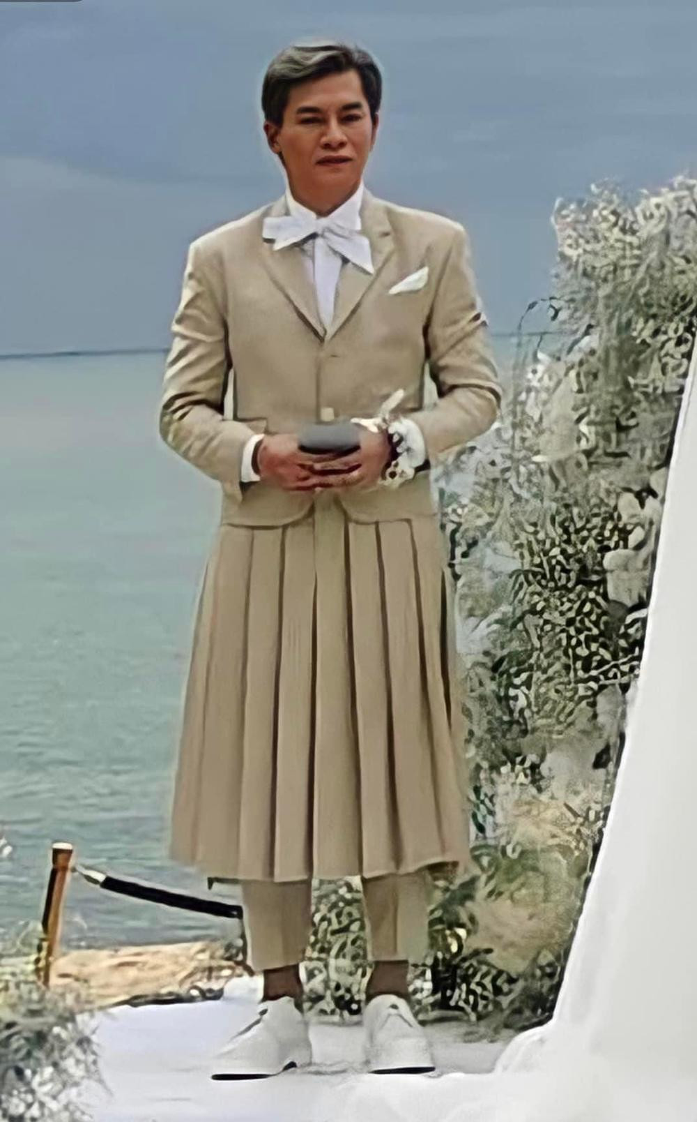 Nam Trung mặc một bộ trang phục khiến nhiều người 'giật nảy' khi thay vì là bộ vét lịch thiệp màu be thì chuyên gia trang điểm đình đám này lại diện chân váy xếp li kèm theo áo vét lửng đầy nữ tính. Bộ trang phục độc đáo của Nam Trung biến anh thành nhân vật được bàn tán xôn xao nhiều nhất đám cưới Ngô Thanh Vân.