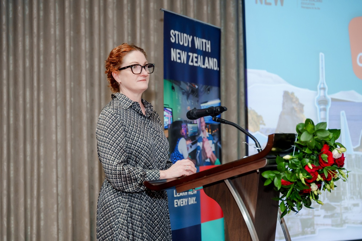 Chỉ còn vài ngày nữa hành trình khám phá xứ sở New Zealand của nhiều bạn sẽ bắt đầu, và buổi giao lưu là một trong những bước đầu tiên trên hành trình đó. Để gửi trao những lời chúc tốt đẹp nhất cho hành trình du học sắp tới, Cơ quan Giáo dục New Zealand đã chuẩn bị những món quà nhỏ nhưng hy vọng sẽ rất hữu ích cho các bạn. Khách mời đặc biệt, bà Caroline Beresford, Đại sứ New Zealand tại Việt Nam lên sân khấu trao quà cho các bạn.