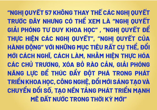 Tổng Bí thư thông tin, nhiều nhà khoa học đã liên lạc với ông, thể hiện tâm huyết, mong muốn đóng góp cho đất nước, bởi nhìn nhận Nghị quyết 57 đề cập đúng vấn đề, đáp ứng đúng mong mỏi của họ. Từ đó, Tổng Bí thư đặt vấn đề, phải làm sao đưa nghị quyết vào cuộc sống.