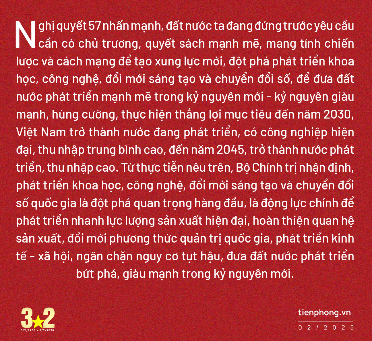 Chỉ 7 ngày sau Hội nghị toàn quốc về đột phá phát triển khoa học, công nghệ, đổi mới sáng tạo và chuyển đổi số, Tổng Bí thư Tô Lâm – Trưởng Ban Chỉ đạo đã chủ trì Phiên họp đầu tiên của Ban Chỉ đạo Trung ương về đột phá phát triển khoa học, công nghệ, đổi mới sáng tạo và chuyển đổi số. Theo Tổng Bí thư, Nghị quyết 57 được đông đảo Nhân dân, nhà khoa học... đồng tình, ủng hộ, đánh giá cao. Qua quan sát cho thấy, có sự đón nhận, ủng hộ từ cả trong và ngoài nước, được coi như nghị quyết "khoán 10" trong khoa học, công nghệ, đổi mới sáng tạo và chuyển đổi số.