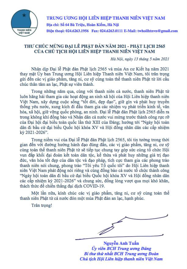 Nhân dịp Đại lễ Phật đản Phật lịch 2565 và mùa An cư Kiết hạ năm 2021 thay mặt Ủy ban Trung ương Hội Liên hiệp Thanh niên Việt Nam, tôi trân trọng gửi đến các vị giáo phẩm, tăng ni, cư sỹ cùng toàn thể thanh niên Phật tử lời cầu chúc thân tâm an lạc, Phật sự viên thành.