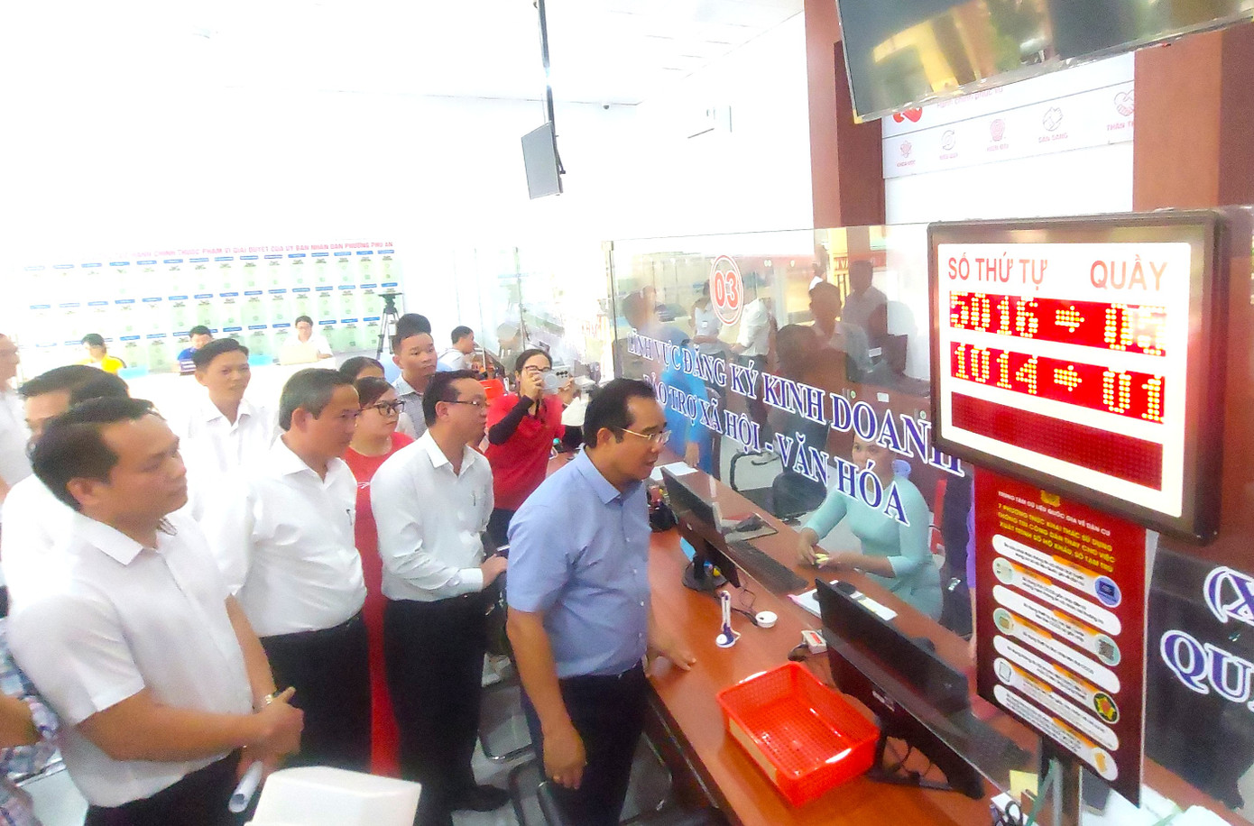 Tại đây, lãnh đạo TPHCM đã đi khảo sát thực tế Trung tâm Phục vụ hành chính công xã Phú An, thăm hỏi người dân đến làm thủ tục hành chính.
