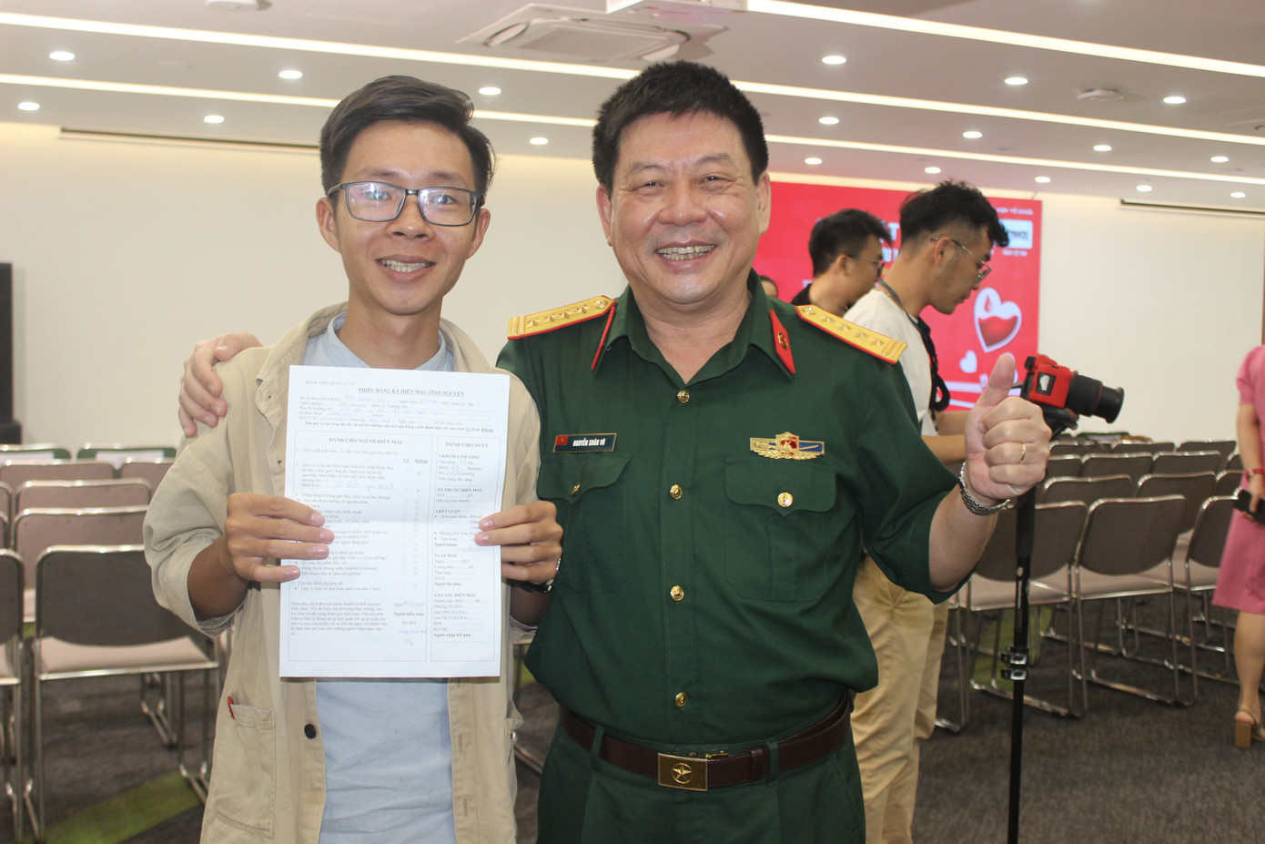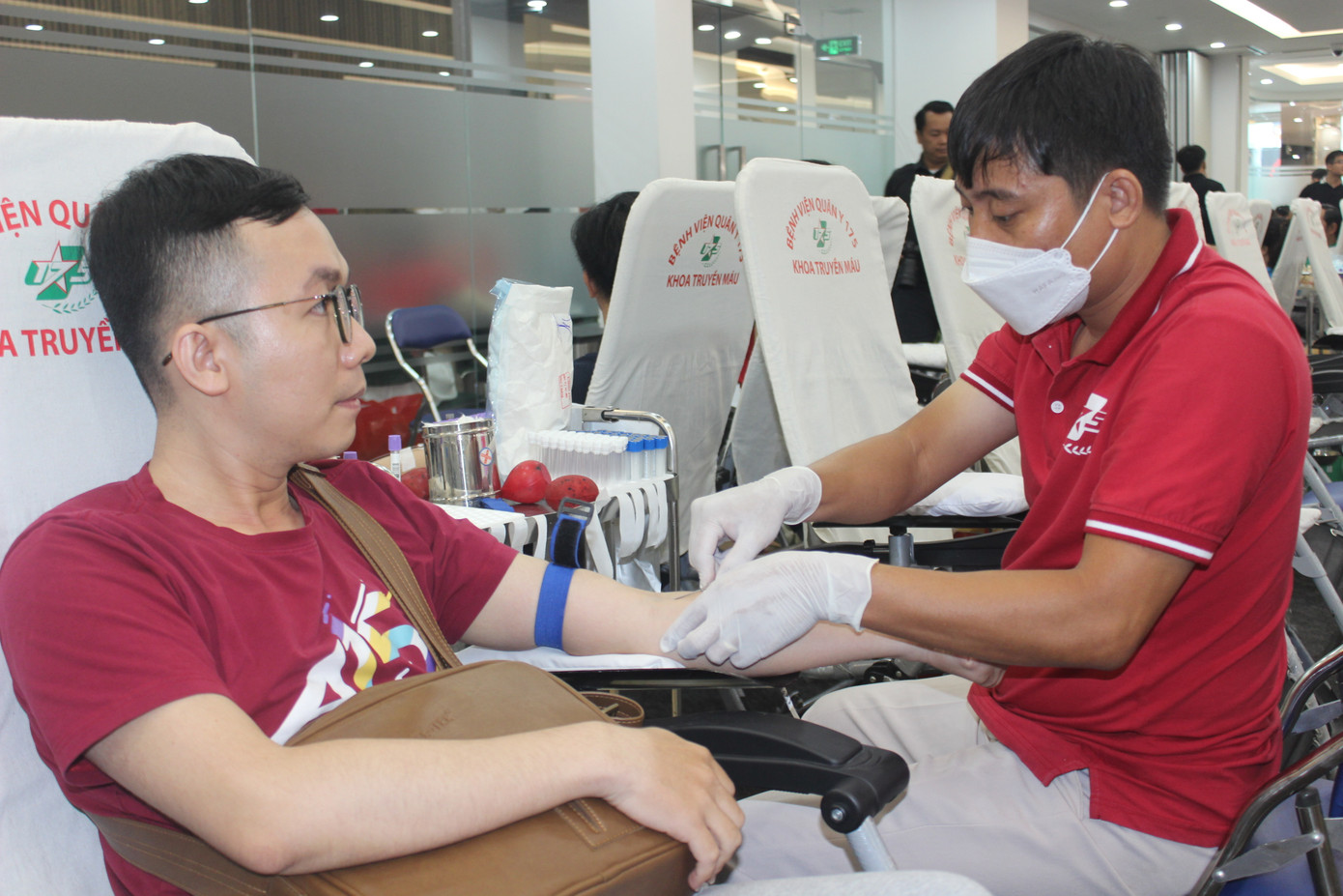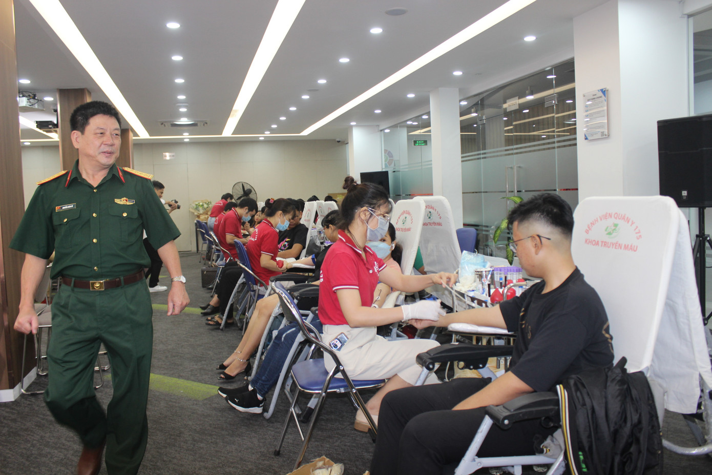 | Đại diện Bệnh viện Quân y 175 hỏi thăm sức khỏe người hiến máu. |