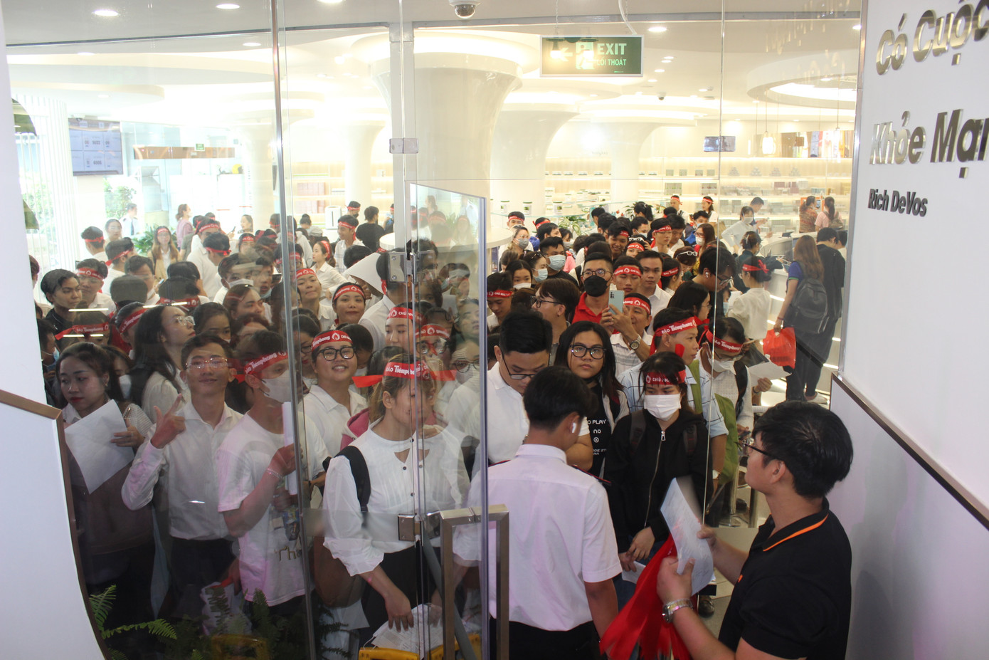 | Ngay từ sáng sớm, rất đông các bạn trẻ cùng xếp hàng tại sảnh để đợi hiến máu tại Ngày hội. |