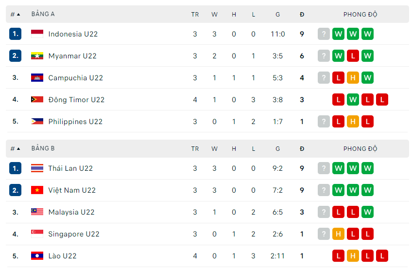 Hiện tại, vấn đề duy nhất của bảng B là cuộc đấu phân định ngôi nhất nhì giữa U22 Thái Lan và U22 Việt Nam. Hai đội tuyển sẽ gặp nhau trực tiếp ở lượt trận cuối cùng để phân thắng bại.