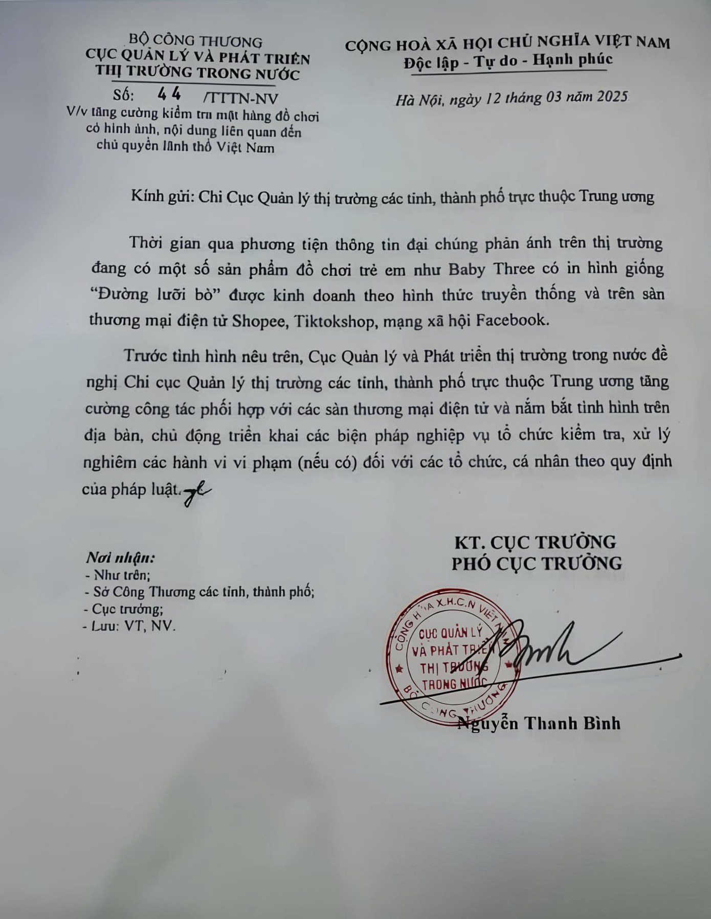 Theo đó, cơ quan quản lý cho biết thời gian qua, phương tiện thông tin đại chúng phản ánh trên thị trường đang có một số sản phẩm đồ chơi trẻ em như Baby Three có in hình giống "đường lưỡi bò" được kinh doanh theo hình thức truyền thống và trên sàn thương mại điện tử Shopee, TikTok Shop, mạng xã hội Facebook.