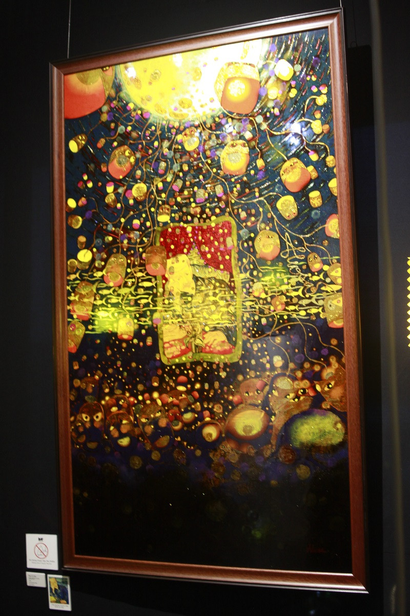 Không chỉ kết hợp hội họa Đông - Tây trong bộ sưu tập tranh cá nhân, Phan Tú Trân còn lồng ghép những câu chuyện đặc biệt của bản thân: “Là một người gốc Hoa, mình rất yêu văn hóa thả lồng đèn để cầu may mắn, bình an cho bản thân và gia đình, và mình mang tình yêu đó thể hiện qua bức tranh Light - Một Bầy Cá Nhỏ làm tranh chủ đề của triển lãm. Mình không vẽ chúng một cách tĩnh tại mà tạo thêm chuyển động hỗn độn qua những chiếc lồng đèn mang theo nhiều ước nguyện và hy vọng đang bay lên khỏi mặt đất. Đó cũng chính là nét văn hóa Á Đông mà mình muốn phái sinh vào.”