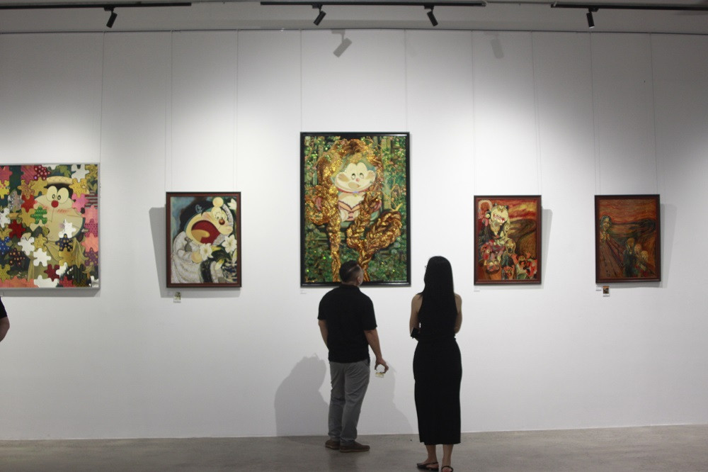 Qua những nét vẽ viền đậm lấy cảm hứng từ dòng tranh manga, mix & match cùng phong cách pop art Nhật Bản với hiệu ứng âm thanh thị giác như chữ “LIKE!”, “LOVE”, “FAITH”, “HOPE”, thế giới truyện tranh trong mơ đã được bê ra đời thực với màu sắc tương phản rực rỡ, bố cục vui mắt, tràn đầy năng lượng dành riêng cho Gen Z. Kỹ thuật sơn mài truyền thống Nhật Bản với gỗ, sơn màu cánh gián và kim tuyến càng làm những bức tranh của họa sĩ Phan Tú Trân thêm phần hoài cổ và lấp lánh khi chiêm ngưỡng trong bóng tối.