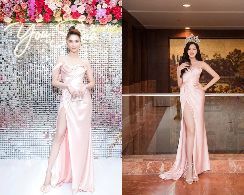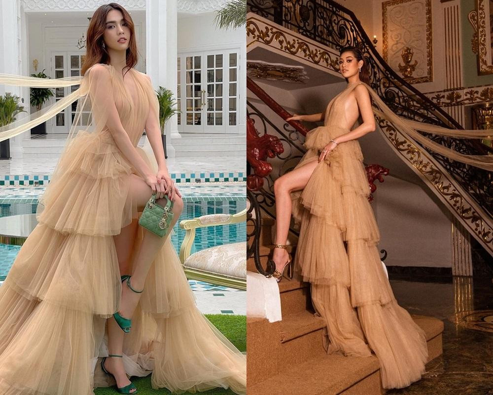 Ngọc Trinh từng được khen xinh như công chúa trong bộ váy voan bồng bềnh nửa kín nửa hở này. Hóa ra, Hoa hậu Khánh Vân cũng từng mặc để chụp ảnh và nhờ tạo dáng bên cầu thang nên Khánh Vân đã khoe được hết thiết kế lộng lẫy của chiếc váy, trong khi Ngọc Trinh lại rơi vào cảnh váy dài quết đất.