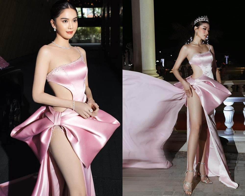 Lại thêm một bộ váy hồng khác được cả Ngọc Trinh và Hoa hậu Đỗ Thị Hà lựa chọn. Không cần soi kỹ quá thì khán giả cũng thấy chiều cao đáng nể đã giúp Đỗ Thị Hà mặc đẹp hơn hẳn, khi phần thân dưới của váy không bị lùng bùng nhiều như của Ngọc Trinh.