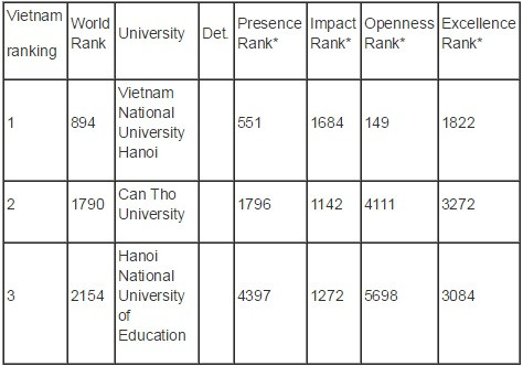 Top 10 cơ sở giáo dục đại học Việt Nam trong bảng xếp hạng là: Đại học Quốc gia Hà Nội (xếp số 1 Việt Nam, 894 thế giới), Đại học Cần Thơ (số 2 Việt Nam, số 1.790 thế giới), Đại học Sư phạm Hà Nội (số 3 Việt Nam và 2.154 thế giới). Tiếp đó là Đại học Đà Nẵng, Đại học Nông Lâm TP HCM, Đại học Duy Tân, Đại học Huế, Đại học Công nghệ TP HCM, Đại học Quốc tế (ĐH Quốc gia TP HCM) và cuối cùng là Đại học Quốc gia TP HCM.