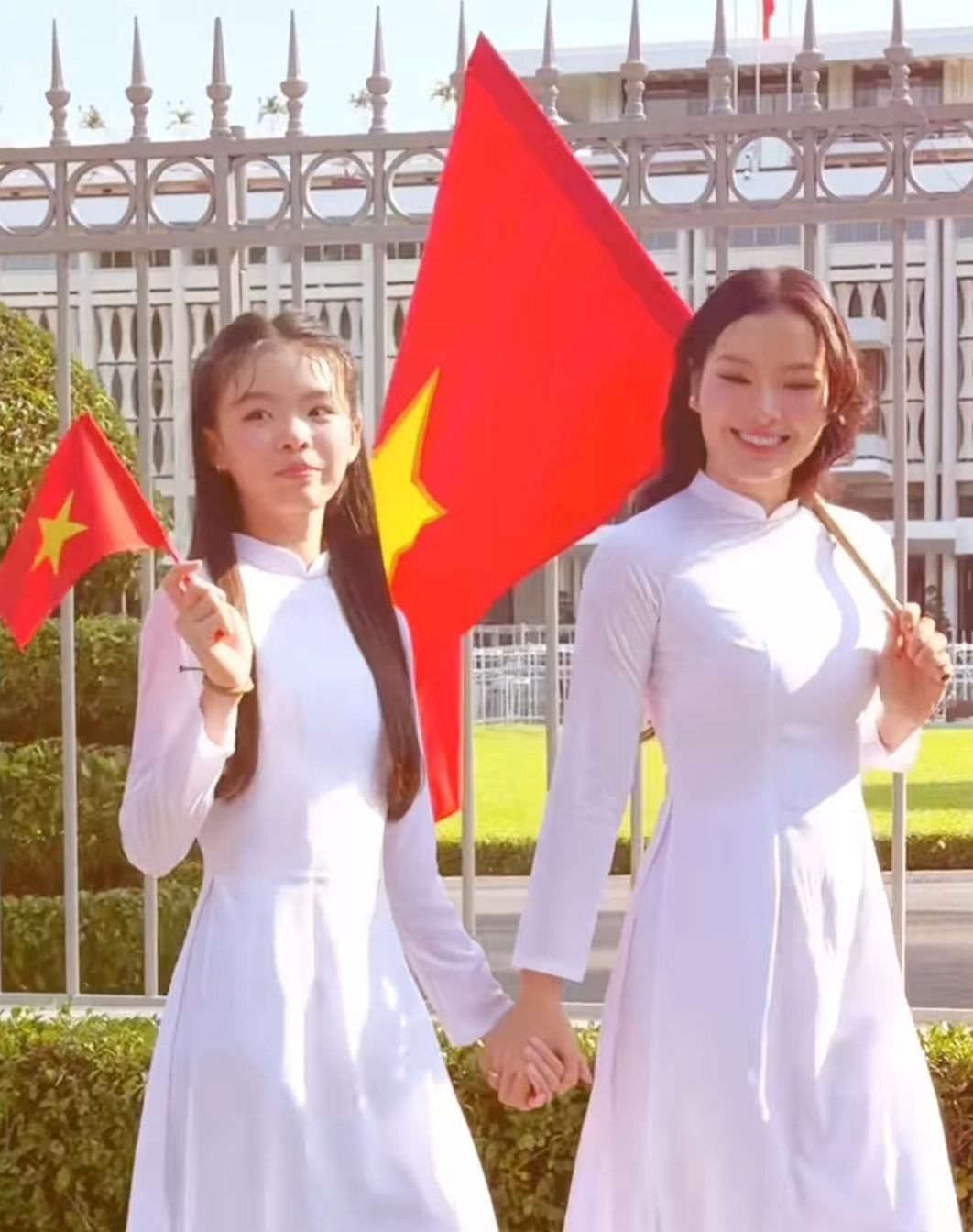 Không nằm ngoài sự háo hức mong chờ đó, nhiều nghệ sĩ cũng chia sẻ những khoảnh khắc đầy tự hào khi diện áo dài, cầm cờ đỏ sao vàng chụp trước Dinh Độc Lập hoặc khu vực công viên bến Bạch Đằng.