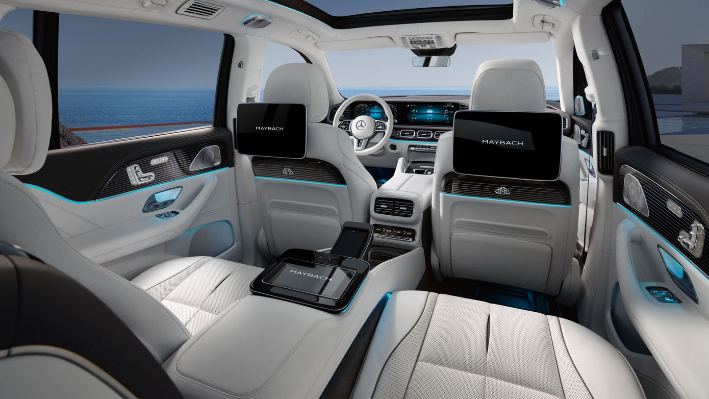 Mercedes-Maybach GLS 600 có không gian nội thất rất rộng rãi với cấu hình 4 ghế ngồi, bao gồm 2 ghế thương gia ở phía sau. Toàn bộ ghế làm bằng chất liệu da Nappa, tích hợp tính năng massage, thông gió và sưởi ấm. Hệ thống thông tin giải trí được đảm nhiệm bởi một màn hình MBUX 12.3 inch. Trong khi đó, hàng ghế thương gia phía sau trang bị 2 màn hình giải trí độc lập, bàn làm việc có cơ cấu gập thông minh cùng tủ lạnh mini.