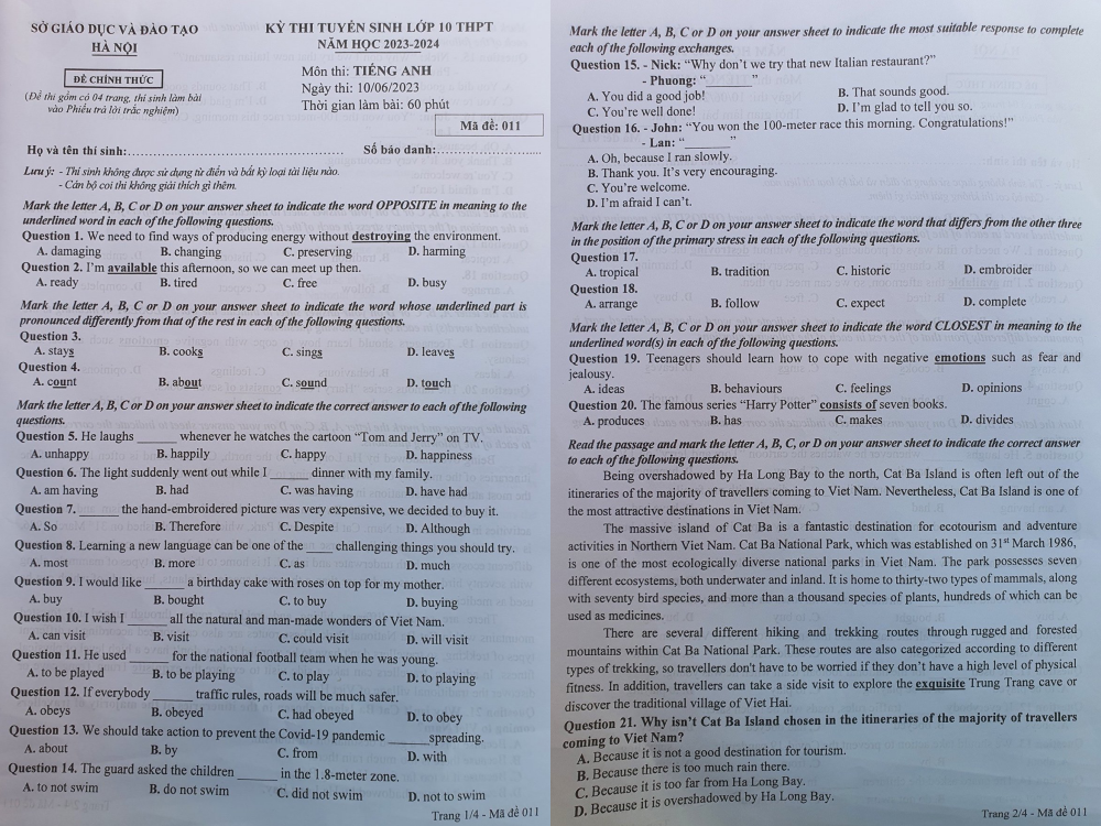| Đề thi tiếng Anh mã đề 011. |