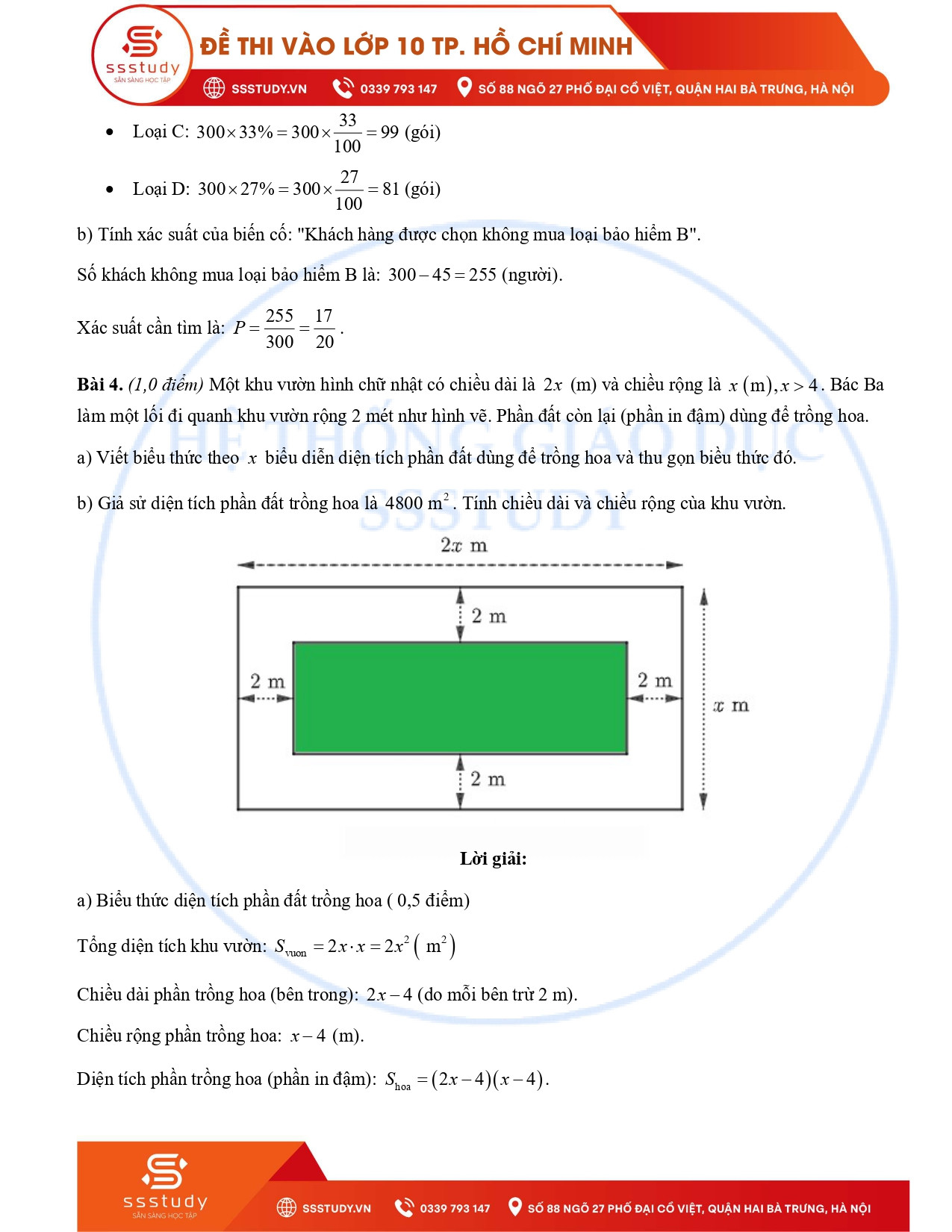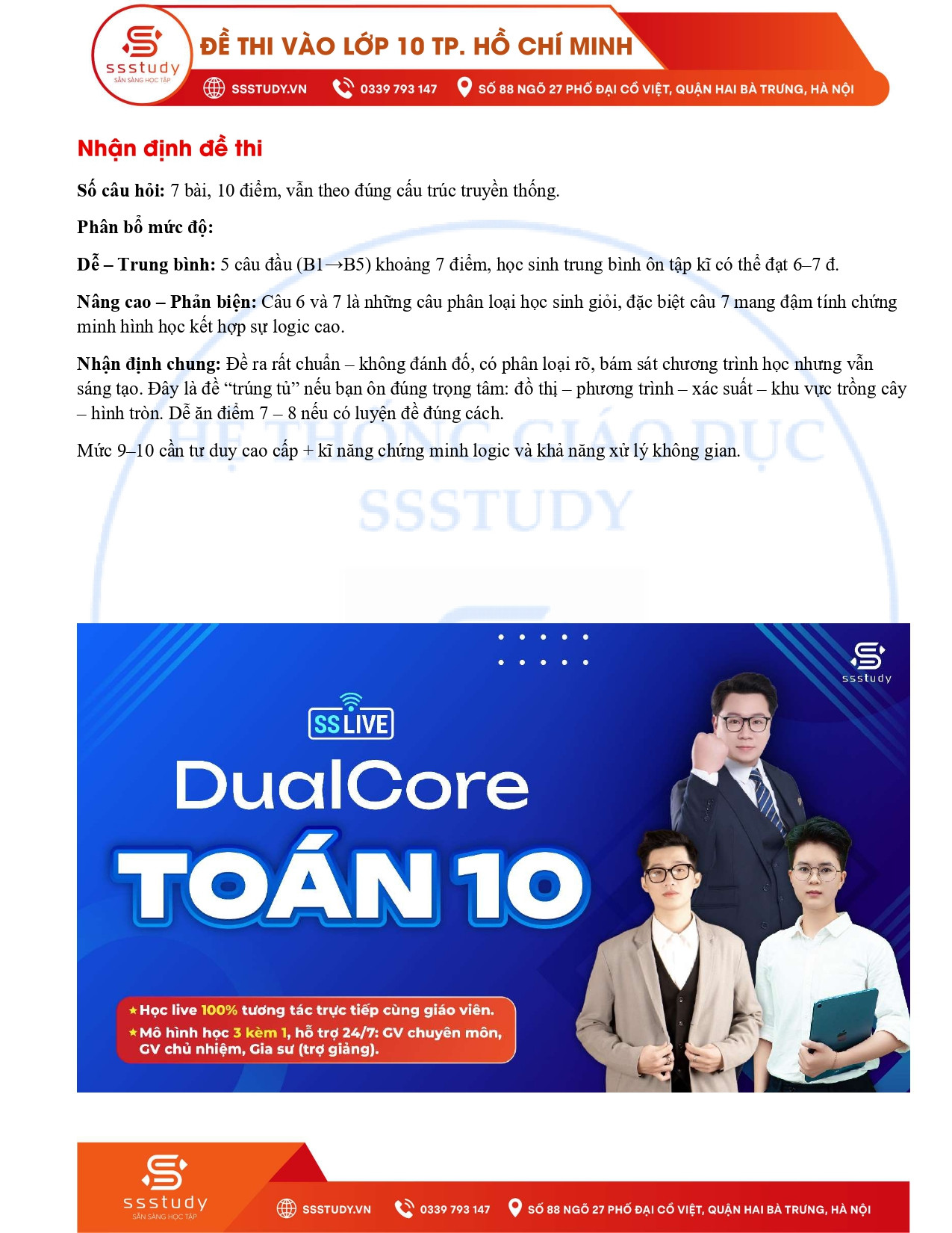 Theo SSStudy, đề thi môn Toán vào lớp 10 năm nay của Sở GD&ĐT TP.HCM ra chuẩn kiến thức, không đánh đố học sinh, có phân loại rõ, bám sát chương trình học nhưng vẫn sáng tạo. Học sinh có thể dễ đạt điểm 7 - 8 điểm nếu có luyện đề đúng cách hoặc đạt 9 - 10 điểm nếu có khả năng tư duy và kĩ năng chứng minh logic và xử lí không gian. Đây là đề “trúng tủ” nếu thí sinh ôn đúng trọng tâm: đồ thị - phương trình - xác suất - khu vực trồng cây - hình tròn.
